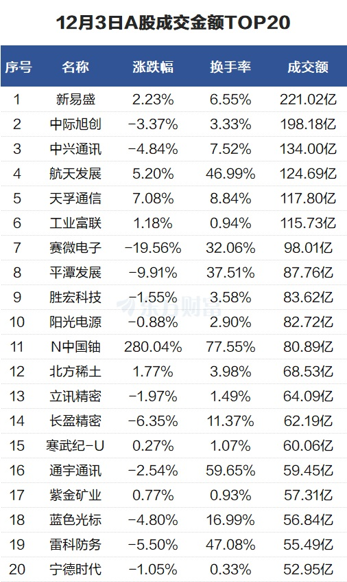 12月3日,上证指数跌0.51%,收报3878点;深证成指跌0.78%,收报12955.25点;创业板指跌1.12%,收报3036.79点。