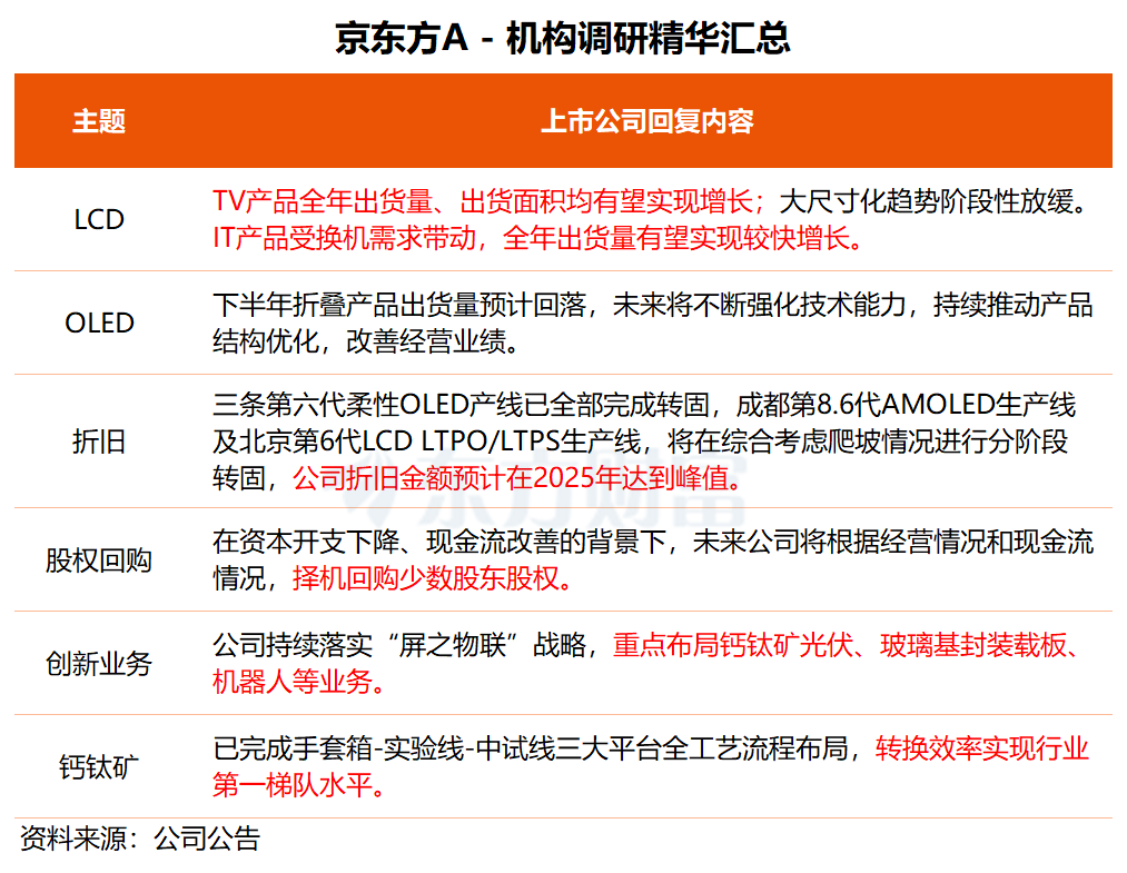 12月3日,多家上市公司发布投资者关系活动记录表公告,披露各自与机构之间的业务交流内容,其中透露出公司业务布局的诸多进展与亮点。 大金重工:首创滚吊一体多功能运输船曹妃甸基地产品明年将出口欧洲 12月2日,大金重工在上海举办公司首创滚吊一体多功能运输船发布会,同步接待了易方达基金、中信建投等近60家机构调研。 在调研中,大金重工表示,III型船是滚吊一体多功能运输船,为全球首创,现已获得ABS(美国船级社)、BV(法国船级社)、DNV(挪威船级社)颁发的AIP证书。与传统重吊船相比,III型船可承载全套风电设备等重大件货物,亦可运输普通干散货与集装箱。I型船和II型船预计从2026年开始执行中国至欧洲的海工运输任务。 关于深远海业务布局,大金重工指出,公司海外海工交付业绩突出,并且是唯一具备深远海专业化产能落地的海工企业,竞争优势明显。 “曹妃甸海工基地将于2026年向欧洲出口海工产品。”大金重工表示,公司唐山曹妃甸海工基地,是定位于打造适应深远海作业需求的超大型风电海工结构(超大超重单桩、导管架、漂浮式基础等)批量化生产能力的世界级超级工厂。其配置并具备全球前沿漂浮式基础结构规模化、产线化的制造能力,在业内为首创,将极大提高公司在深远海市场的综合竞争力。 大金重工还透露,未来公司将在欧洲市场深化布局,重点在总装制造、母港服务、运输服务等方面推动进一步落地,从而加强公司在欧洲市场的竞争力,提升欧洲本地化供应比例。 ![]() 大金重工是海上风电基础结构及塔筒解决方案领域的全球领先企业,今年前三季度,公司实现营收45.95亿元,同比增长99.25%;归母净利润为8.87亿元,同比增长214.63%。 中泰证券指出,公司欧洲海风布局逐步兑现,往后看,随着欧洲海风需求迎来高峰期、招标进展加速,同时公司顺势加快深远海漂浮式以及超大海工产品产能布局,欧洲50万吨产能规划有效配套国内制造,推动订单高增。此外,规模效应+产能匹配优化+自有船只运输,进一步提升利润弹性。 值得一提的是,中泰证券在研报中表示,考虑公司海工产品出口及盈利超预期,上调公司业绩预期。预计公司2025将实现归母净利润10.7亿元,同比增长126%。 二级市场方面,大金重工今日午后封涨停,股价创逾3年以来新高,总市值达352亿元。 京东方A:IT和TV产品出货量预增钙钛矿转换效率已达行业第一梯队水平 京东方A于12月2日接受国联基金调研。公司在交流中表示,TV产品全年出货量、出货面积均有望实现增长;IT产品受换机需求带动,全年出货量有望实现较快增长。12月,因备货需求的释放,根据咨询机构预测,行业有望实现较高的稼动率水平,产品价格有望企稳回升。 关于折旧趋势,京东方A透露,公司折旧金额预计在2025年达到峰值,将持续优化产品产线定位,进一步提升运营效率,持续改善盈利水平。此外,在公司资本开支下降、现金流改善的背景下,未来公司将根据经营情况和现金流情况,择机回购少数股东股权。 创新业务布局方面,京东方A表示,公司重点布局钙钛矿光伏、玻璃基封装载板、机器人等创新业务。钙钛矿光伏业务已完成从手套箱(2.5*2.5cm)到实验线(30*30cm)再到中试线(120*240cm)三大平台全工艺流程布局,转换效率实现行业第一梯队水平。 ![]() 京东方A是半导体显示行业龙头,公司前三季度实现营收1545.48亿元,同比增长7.53%;实现归母净利润46.01亿元,同比增长39.03%。 中泰证券研报指出,公司为LCD行业龙头,在LCD整体及五大主流应用领域出货量继续稳居全球第一,车载、零售、医疗、IoT等创新市场继续保持全球领先,后续随着公司产线折旧陆续到期及大尺寸化公司高世代线的优势,公司利润有望迎来向上拐点。 二级市场方面,京东方A股价今日上涨3.87%,总市值约1500亿元。