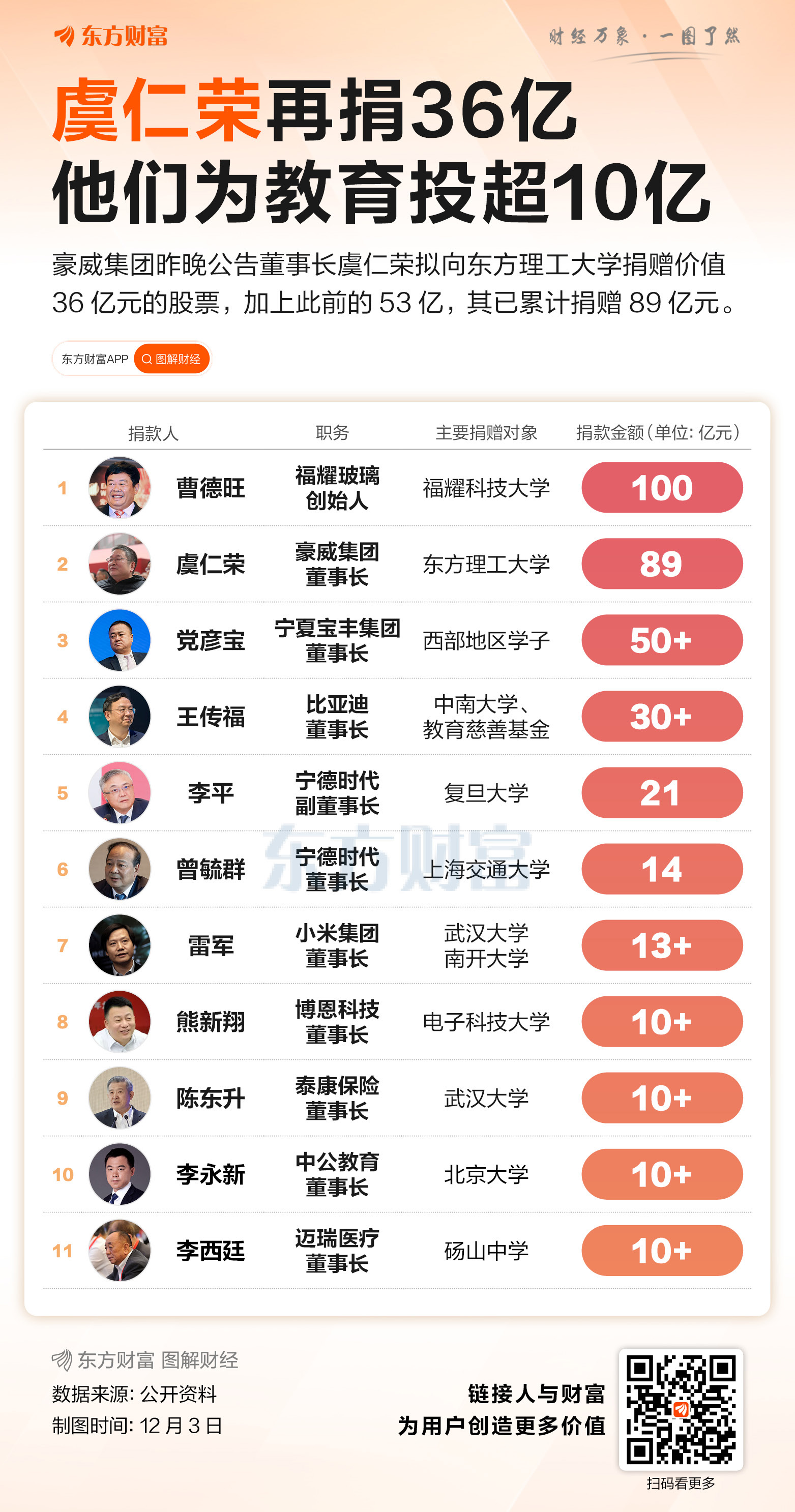 ![]() 豪威集团12月2日晚公告称,控股股东虞仁荣拟向宁波东方理工大学教育基金会无偿捐赠其持有公司的3000万股无限售条件流通股。结合豪威集团当前股价,虞仁荣此次捐赠的股份价值约36亿元,至此,他已累计向东方理工大学捐赠89亿元。 据不完全统计,除了虞仁荣之外,还有不少企业家为了国内的教育事业投入过超10亿的大手笔。 “玻璃大王”曹德旺于2021年通过河仁慈善基金会捐资100亿元筹建福耀科技大学,致力于培养应用型技术人才,计划招生规模3000—5000人,2025年9月已正式开学。 宁夏宝丰集团董事长党彦宝的慈善之路始于2011年。据公益时报,党彦宝开启慈善之路后,每年拿出企业10%的利润注入宁夏燕宝慈善基金会,至今已有14年,累计捐资超过50.38亿元,资助了43.08万名西部学子。 比亚迪董事长王传福于从2009年开始,向母校中南大学捐款;2024年12月他宣布捐资30亿元成立教育慈善基金,联合全国百余所高校设立奖学金,助力国家培养更多人才。 2025年4月,复旦大学建校120周年之际,宁德时代副董事长李平与其夫人廖梅宣布为母校复旦大学一次性捐资10亿元人民币,支持建设复旦大学学敏高等研究院。短短几个月后,李平再度宣布向上海复旦大学教育发展基金会捐赠405万股公司股票,这笔捐赠估值超过11亿元。 2021年,上海交通大学成立125周年,宁德时代董事长曾毓群向上海交大教育发展基金会捐赠其持有的宁德时代200万股股票(按当时市值约14亿元人民币),用以支持溥渊未来技术学院发展,助力培养未来关键核心技术领军人才。据悉,曾毓群为上海交大船舶海洋与建筑工程学院1989届本科校友。 2023年武汉大学130周年校庆之际,武汉大学1987级计算机系校友雷军以个人名义向学校捐赠了13亿元,刷新了武汉大学建校以来单笔最大捐赠额。2024年,雷军与字节跳动联合创始人兼CEO梁汝波共同向南开大学捐赠2亿元,专项支持数学学科发展及人才培育。 2016年,博恩集团董事长、电子科技大学1986级校友熊新翔于在母校60周年校庆之际捐资10.3亿元设立“博恩教育发展基金”以支持电子科技大学的发展。 2021年,泰康保险集团成立25周年之际,泰康集团创始人、董事长兼首席执行官陈东升向其母校武汉大学捐赠10亿元,设立“武汉大学泰康医学与教育基金”,用于支持建设一流医学和生命科学学科,提升我国医学和生命科学领域的科技创新能力。 2021年3月北京大学发布消息称,中公教育集团董事长、1995级校友李永新及其创建的北京中公公益基金会捐资10亿元,设立北京大学中公教育发展基金,全面支持北大学科建设、教学科研、师资队伍和人才培养等各方面的发展。据华夏时报,李永新在此前已经向北京大学捐赠达1亿8千万元。 2022年,迈瑞医疗董事长李西廷宣布捐资10亿元建设老家安徽省宿州市的砀山中学新校区。早在2004年,李西廷就向砀山中学等地捐款645万元,助力家乡教育事业发展;2010年又向砀山中学捐赠600万元教育基金,用于建设图书馆。 在中国经济蓬勃发展的背景下,一批有社会责任感的民营企业家挺身而出,用实际行动支持中国教育事业的发展。他们的慷慨捐赠不仅改变了众多莘莘学子的命运,更为中国教育的未来播下了希望的种子。除上述企业家之外,阿里马云、拼多多黄铮、京东刘强东、腾讯马化腾等也都向高校捐赠过亿元级善款。