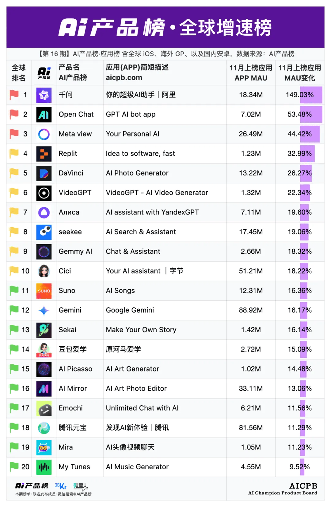格隆汇12月3日|AI行业榜单“AI产品榜”发布最新月度数据。阿里巴巴最新推出的千问App凭借爆发式增长,位列全球AI应用增速榜第一名,月活增速高达149.03%。该应用于11月17日开启公测,上线仅一周,下载量便突破1000万大关。