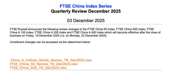 又有重要指数成份股调整。 12月3日,富时罗素宣布对富时中国50指数、富时中国A50指数、富时中国A150指数、富时中国A200指数、富时中国A400指数的审核变更。该变更将于2025年12月19日星期五收盘后生效。 ![]() 据了解,富时罗素在选股的时候,一般都是根据专业分析、实地考察以及过往的盈利能力作为准则,因此被富时罗素“青睐”的公司在过去的一年经营情况在A股范围内也是个中翘楚。 纳入这些股票 具体来看,富时中国A50指数纳入洛阳钼业、阳光电源;删除江苏银行、顺丰控股。 ![]() 富时中国A50指数由富时罗素编制并发布。该指数由上海和深圳证券交易所市场中总市值最大的50只股票组成,反映A股市场中最具影响力的前50大上市公司股票的表现,不少国际投资者把这一指数看作是衡量中国市场的精确指标。 富时中国50指数成份股将纳入中国宏桥、宁德时代、恒瑞医药等港股,剔除中信建投证券、长城汽车、理想汽车等港股。 ![]() 富时中国A150指数的成份股也有所调整,纳入影石创新、江苏银行、华电新能、顺丰控股、江波龙、华友钴业等股票,剔除洛阳钼业、德赛西威、长电科技、宝信软件、上海医药、阳光电源等股票。 ![]() 富时中国A200指数纳入影石创新、华电新能、江波龙、华友钴业等股票,剔除德赛西威、长电科技、宝信软件、上海医药等股票。 ![]() 富时中国A400指数的调整范围更大,纳入安集科技、白银有色、屹唐股份、蓝色光标等多只股票,同时也剔除了芯动联科、一品红、光环新网、华熙生物等股票。 ![]() 带来增量资金 富时罗素此次调整将为被纳入的个股吸引被动资金配置,并将带动海外资金关注配置中国资产。 公开资料显示,富时罗素于1984年在英国伦敦成立,是伦敦证券交易所全资子公司。富时罗素是与明晟公司齐名的全球知名指数机构,其指数产品覆盖全球70多个国家和地区市场。作为全球指数行业的领导者,富时罗素为全球投资者提供创新的基准、分析和数据解决方案,约20万亿美元资产以富时罗素指数产品为基准开展投资。 值得投资者关注的是,在市场回暖的背景下,外资对A股市场的看法倾向乐观。国际金融协会数据显示,2025年前10个月,境外资金流入中国股市规模达506亿美元,这一数字已远超2024年全年的114亿美元,增幅超过3倍。 瑞银证券中国股票策略分析师孟磊12月1日表示,2026年A股市场料更上一层楼。全部A股盈利增速有望从今年的6%进一步升至8%。名义GDP增速提升和PPI跌幅收窄将推升企业营收增速。支持政策的推出以及“反内卷”的推进将带动利润率复苏。 摩根大通将中国股票评级上调为“超配”。该机构认为,相比潜在下行风险,明年出现大幅上涨的可能性更高。近期市场回调反而形成了具有吸引力的介入时点。预计明年在AI普及、消费刺激与治理改革推动下更有可能迎来亮眼表现。 摩根士丹利近日发布报告称,将2026年12月沪深300指数目标点位定为4840点。在盈利温和增长、估值在更高水平上企稳的背景下,中国在全球科技竞赛中站稳脚跟。相关指数整体仍具备相对温和的上行空间。该机构推荐"超配"高质量互联网和科技龙头股。