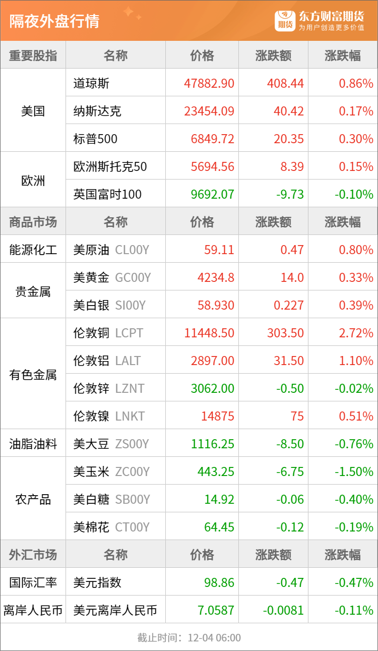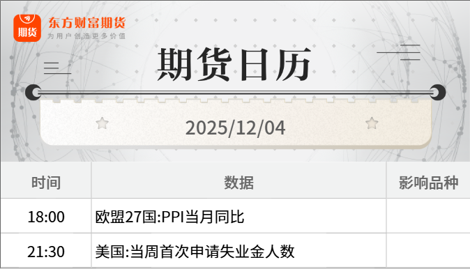 隔夜行情![]() ![]() 每日精选李强主持国务院专题学习:新型城镇化发展空间仍然很大 硅业分会:展望12月国内多晶硅产量预计仍将维持在12万吨以内 集体狂飙!铜价刷新历史高点 美国资金大肆囤货 宏观产经央视新闻:12月3日,外交部发言人林剑主持例行记者会。有记者问,中共中央政治局委员、中央外办主任王毅日前访问了俄罗斯,发言人能否介绍一下访问的情况,对访问有何评价?林剑表示,12月2日,中共中央政治局委员、中央外办主任王毅在莫斯科同俄罗斯联邦安全会议秘书绍伊古共同主持了中俄第二十轮战略安全磋商,并与俄罗斯外长拉夫罗夫会见,双方就双边关系及两国战略安全利益的重大问题全面、深入沟通,达成新的共识,增进了战略互信。双方一致同意全力落实两国元首重要共识,推动中俄关系和两国战略协作向更高质量迈进。 央视新闻:记者从商务部了解到,今年1—11月,消费品以旧换新带动相关商品销售额超2.5万亿元,惠及超3.6亿人次。其中:汽车以旧换新超1120万辆,家电以旧换新超12844万台,手机等数码产品购新补贴超9015万件,电动自行车以旧换新超1291万辆,家装厨卫“焕新”超1.2亿件。 央视新闻:今天(3日)下午,法国总统马克龙乘机抵达北京首都国际机场,开启为期三天的访华之行。这是他第四次对中国进行国事访问,也是对去年中法建交60周年之际中国领导人对法国进行历史性国事访问的回访。 品种资讯黑色系期货 钢材:据Mysteel调研,11月份全国建筑钢材生产企业共计42家企业进行了减产检修,较上个月增加9家。铁水:根据测算,11月减产检修影响铁水产量43.75万吨,环比增加125.52%;影响粗钢产量69.78万吨,环比增加74.19%。建筑钢材:影响产量201.34万吨,环比增加14.27%。其中,螺纹钢影响量125.25万吨,环比减少4.45%;线盘影响量74.69万吨,环比增加65.98%。(Mysteel) 不锈钢:10月份,全国不锈钢粗钢产量362.44万吨,环比增加7.87万吨,增长2.22%。其中,Cr-Ni系不锈钢产量190.12万吨,环比增加8.66万吨,增长4.77%;Cr-Mn系不锈钢产量109.01万吨,环比增加7.18万吨,增长7.05%;Cr系不锈钢产量58.53万吨,环比减少8.38万吨,降低12.53%;双相不锈钢47923吨。(中钢协) 锰硅:贵州兴义地区某大厂月底全面停炉,影响硅锰日产能600吨左右,因倒挂严重,短期无复产计划,目前兴义地区仅剩一台硅锰矿热炉生产,产量处于全年低位。(Mysteel) 铁矿石:巴西淡水河谷公司表示,公司已对多项预期作出更新,其中2026年铁矿石产量将介于3.35亿至3.45亿吨,低于此前给出的3.4亿至3.6亿吨区间。(财联社) 农产品期货 棕榈油:路透公布调查显示,马来西亚11月份原棕榈油产量估计为198万吨,较10月份下降3%;出口预计为144万吨,较10月份下降14.9%;11月期末库存预计为266万吨,较10月增长7.78%。(新华财经) 淀粉:本周华北玉米淀粉个别企业继续提产增量,整体玉米淀粉行业开机率小幅升高。 本周(2025年11月27日-12月3日)全国玉米加工总量为62.68万吨,较上周增加0.22万吨;周度全国玉米淀粉产量为32.49万吨,较上周产量增加0.15万吨;周度开机率为61.66%,较上周升高0.28%。(Mysteel) 生猪:财政部修订《生猪(牛羊)调出大县奖励资金管理办法》,其中提到,各省要优化生猪产能调控机制,稳定牛羊肉基础生产能力等。调出大县要加强资源统筹,促进生猪(牛羊)生产流通和产业发展。生猪调出大县奖励资金按照因素法分配到县。牛羊调出大县奖励资金按因素法分配到县。(财联社) 有色/贵金属期货 沪铜:受LME铜仓单大幅注销超5万吨影响,注销货物主要来自亚洲仓库,伦铜持续走高,再度创造历史新高。截至12月3日,伦铜总库存为16.22万吨,注销仓单库存为5.69万吨,占比35.08%。调研了解,12月国内精炼铜依然保持高出口的状态,且12月出口量有环比增加的趋势。(Mysteel) 伦敦金属交易所(LME)的数据显示,其追踪的仓库的铜提货申请量激增50,575吨,达到56,875吨。这是按吨数计,2013年以来的最大增幅。(界面新闻) 摩根大通预计,供应严重中断与全球库存错配,或将推动铜价于2026年上半年涨至12,500美元/吨。(财联社) 黄金:摩根大通维持对黄金的多年看涨前景,预计到2026年,持续强劲的央行和投资者需求将推动金价升至每盎司5000美元。(财联社) 碳酸锂:大中矿业(001203.SZ)12月3日在投资者互动平台表示,四川加达锂矿《矿产资源开采方案》已通过评审。目前,正在推进《生态修复方案》的编制与评审工作,具体进展请以公司后续公告为准。(每日经济新闻) 智利海关公布的数据显示,智利11月锂出口量为20006吨,其中碳酸锂出口量为17963吨。当月对中国出口碳酸锂14693吨。(Mysteel) 沪铝:据悉目前有一家铝生产商于2026年第一季度首次提供的CIFMJP(日本主要港口铝锭升水)报价为每吨190美元,较2024年四季度报盘显著上涨。(SMM) 能化期货 纸浆:据悉,当地时间12月2日,Domtar宣布将永久关闭其位于加拿大BC省狮牌(Crofton)工厂。该决定将使Domtar的纸浆年产量减少约38万吨NBSK针叶浆。(隆众资讯) 山东博汇纸业股份有限公司发布公告,利用自有资金开展期货套期保值业务。在决议有效期内任一时点占用的保证金最高额度不超过人民币 1.5 亿元(不含标准仓单交割占用的保证金规模)。(新华财经) 沥青:截至12月3日当周,中国92家沥青炼厂产能利用率为30.1%,环比增加0.6%,国内重交沥青77家企业产能利用率为27.9%,环比增加0.1%。(隆众资讯) 甲醇:截至2025年12月3日,中国甲醇港口库存总量在134.94万吨,较上一期数