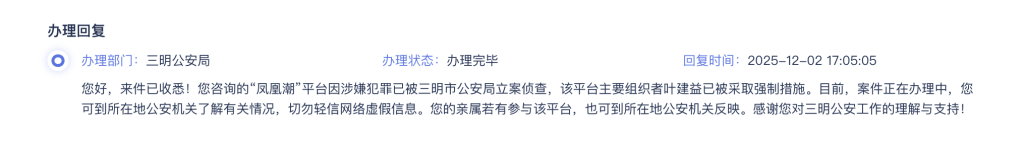 一边是警方对“凤凰潮”平台的立案侦查,一边是社交平台上依然充斥此起彼伏的虚假复工信息。 尽管多地政府早已发文警示其涉嫌传销式资金盘骗局,澎湃新闻注意到,目前多个相关账号已被屏蔽,且警方已明确“凤凰潮”平台因涉嫌犯罪已被立案侦查、平台组织者被采取强制措施,但仍有追随者二次受骗。 11月20日,澎湃新闻发布《凤凰潮APP实控人叶建益因涉嫌传销被刑拘,此前多地政府发出风险提示》指出,凤凰潮的实控人叶建益因涉嫌传销犯罪已被福建三明警方刑拘。 12月2日,福建省三明市公安局通过政务平台发布回应,明确指出:“凤凰潮”平台因涉嫌犯罪已被立案侦查,该平台主要组织者叶建益已被采取强制措施。目前,案件正在办理中。 警方同时提醒,相关人员可到所在地公安机关了解有关情况,切勿轻信网络虚假信息。亲属若有参与该平台,也可到所在地公安机关反映。 ![]() ![]() 澎湃新闻注意到,11月至今,仍有众多平台参与者质疑媒体报道真实性并坚持认为APP只是出现技术故障。不少“凤凰潮”参与者在相关微信公众号留言,追问平台何时完成升级、何时恢复打卡功能等。 从记者获取的信息来看,关于“凤凰潮”要恢复运营已经出现过数个版本,多个相关个人账号通过社交平台发布各类消息。 起初,一个名为“国海数商创业”的公众号曾于11月19日发布《凤凰潮(国海)暂停打卡:为什么有人说“要出事”?真相恰好相反》的文章,将平台暂停打卡等功能解释为“防火墙强化、功能调整及舆情隔离系统升级”,称升级为期3-5天,目的是扩容平台承载量。 不过,澎湃新闻注意到,上述发布相关文章的账号近日已陆续遭监管处置,包括“国海数商生态”、“国海数商创业”等多个涉及宣传“凤凰潮”的微信公众号,均因涉嫌违反法律法规和政策被屏蔽。 ![]() 微信公众号“国海数商生态”、“国海数商创业”账号已被屏蔽 此后,各类相关消息在社交平台持续发酵。有个人账号宣称“数据搬迁上传已经完成!1号前大概可以先开放打卡。”;12月2日,微信公众号“国海网报”发布消息称“一周左右恢复系统,总部即将官宣”;更有标注为叶建益的账号直接预告,将于12月7日开播回应。 ![]() ![]() 凤凰潮APP介绍显示,该平台隶属于海南省国海创新科技有限公司,以“凤凰潮数字电商”自居,号称是数字经济时代的财富增长新引擎,主打“零成本、零门槛”,参与者仅需每日打卡就能赚取积分和奖励,其对外解释底层逻辑为APP和小程序的宣传推广。 工商信息显示,该平台主体运营公司海南省国海创新科技有限公司成立于2021年9月,注册资本1000万元,实缴出资0元,由叶建益100%持股并担任法定代表人。 但事实是,11月下旬起“凤凰潮”APP已无法正常打开,登录会接到反诈中心的电话。有受害人家属反映,平台关停后疑似换壳为“凤凰V讯”继续运作,后续“凤凰V讯”账号积分也已清零,登录时显示网络繁忙。 同时,多地政府早已对“凤凰潮”的风险发出预警。今年1月,其APP上线地遵义市市场监督管理局就发布风险提示,指出桐梓、湄潭、绥阳、习水、新蒲等地部分群众下载一款名为 “凤凰潮”的手机APP,以拉人头入会赚取工分的形式谋取利益,其运作模式与组织、领导传销活动高度相似。此后,湖南金融、贞丰公安、万盛发布等至少十余个官方认证微信公众号先后发文警示其涉嫌传销式资金盘骗局。 多位受害者及家属的遭遇也印证了骗局危害。广东省中山市一位受害人家属梁先生透露,自9月起他就持续向公安机关、国家工商总局等部门举报。据介绍,其妻子5月在佛山接触“凤凰潮”后,被“做一次富三代”噱头吸引,经三天课程后深度洗脑,卖掉家中车辆并向平台投入四十万元,致使上大学的女儿需借网贷凑学费。梁先生称,后续妻子离家出走,搬去出租屋与其他参与者一同参与所谓“事业”,他认为这种洗脑危害比吸毒更甚。 12月2日,有受害者家属告诉澎湃新闻,“现在还有一些地区的小头目在自己申请的公众号里发布假消息,推出什么年终福利,依然有追随者第二次上当受骗,之所以会这样,是因为这些头目发展了不少下线,如果平台崩溃的消息得到官方确认,那么下线会找这些头目麻烦,所以只能不断造谣,稳定人心。” 12月2日,三明市公安局工作人员向澎湃新闻表示,案件处于侦办阶段,受害者可在所在地派出所反映。对于后续是否会发布警情通报,可关注微信公众号。 (文章来源:澎湃新闻) |