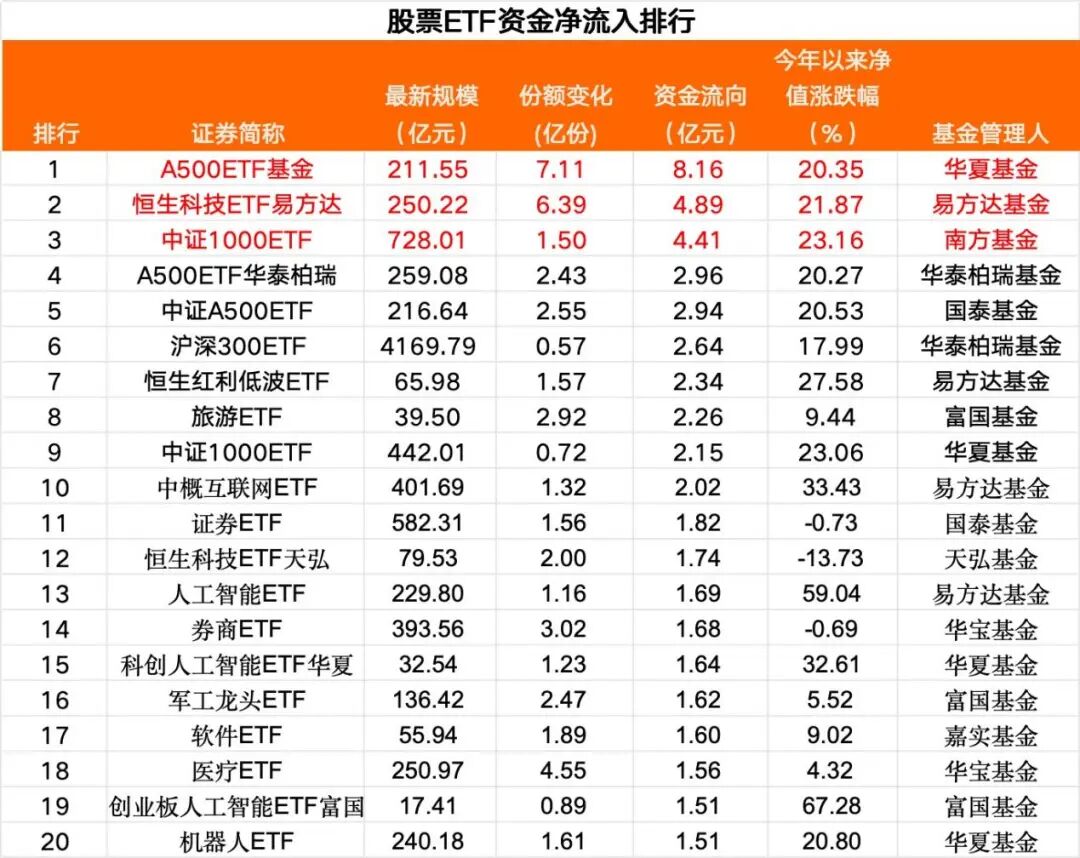 继续加仓!昨日股票ETF资金净流入近49亿元 炒股第一步,先开个股票账户 12月3日,A股市场呈现震荡态势,三大指数集体下行,沪深两市成交1.68万亿元。 部分资金逢低进场,昨日全市场股票ETF(含跨境ETF)资金净流入近49亿元,这是12月以来连续第二个交易日实现资金净流入。中证A500、中证1000等宽基ETF,以及恒生科技、红利、人工智能等行业主题ETF资金净流入居前。 QDII相关ETF领涨 Wind数据显示,截至12月3日,全市场1270只股票ETF总规模达4.53万亿元。 当日,股票ETF成交额合计1464.73亿元,较前一交易日的1371.73亿元有所放量。其中,华夏基金旗下A500ETF基金成交62.68亿元,名列首位。 此外,香港证券ETF(易方达)、A500ETF基金华泰柏瑞、中证A500ETF(国泰基金)、A500ETF易方达成交额在40亿元以上,A500ETF(南方)、恒生科技ETF(华泰柏瑞)、创新药ETF(广发)、恒生科技指数ETF(华夏)成交额也在30亿元以上。 从股票ETF二级市场表现看,纳指相关ETF领涨,纳指科技ETF(景顺长城)、纳指100ETF(汇添富)、纳指生物科技ETF(汇添富)涨幅均超2%。 线上消费、信创、影视传媒等相关ETF表现不佳,当日股票ETF跌幅居前的为线上消费ETF、创业板软件ETF、游戏ETF、计算机ETF、影视ETF、传媒ETF等,跌幅均在2%以上。 ![]() 昨日股票ETF资金净流入近49亿元 市场调整,部分资金选择逢低进场。Wind数据显示,12月3日,股票ETF市场总份额增加42.30亿份,按照成交均价测算,当日净流入资金达48.94亿元。其中27只股票ETF资金净流入超过1亿元。 从全市场ETF来看,12月3日资金净流入50.8亿元,港股市场与宽基ETF资金净流入居前,分别达18.67亿元与18.18亿元。 易方达数据显示,当日资金流入前5板块为中证A500指数(净流入14.8亿元)、恒生科技指数(净流入8.2亿元)、红利指数(净流入8.1亿元)、中证1000指数(净流入6.7亿元)、人工智能指数(净流入5.5亿元)。 具体到指数维度,12月3日,中证A500指数ETF资金净流入居前,达14.85亿元;上证50指数ETF资金净流出居前,达5.34亿元。 ![]() 当日,11只股票ETF资金净流出超过1亿元,银行、化工、酒、养殖等行业主题ETF以及上证50ETF、中证500ETF等宽基ETF资金净流出较多。 ![]() 头部公募旗下ETF产品“吸金” 数据显示,头部基金公司旗下部分ETF持续“吸金”。 12月3日,易方达基金旗下ETF最新规模为8031.6亿元,2025年以来规模增加2025.1亿元(其中,资金净流入556.1亿元,净值增加1469亿元)。当日,恒生科技ETF易方达净流入4.9亿元;恒生红利低波ETF净流入2.3亿元,最新规模约为66亿元,创历史新高;中概互联网ETF净流入2.0亿元,人工智能ETF净流入1.7亿元,科创板50ETF净流入1.1亿元。 华夏基金方面,A500ETF基金和中证1000ETF单日净流入居前,分别达8.16亿元和2.15亿元;最新规模分别达211.55亿元和442.01亿元,对应跟踪指数近1个月日均成交额分别为53.95亿元和5.8亿元。此外,黄金ETF华夏净流入2.03亿元,规模突破百亿元大关;科创人工智能ETF华夏和机器人ETF分别净流入1.63亿元和1.51亿元。 嘉实基金认为,短期市场存在一定的整固需求,不过,对未来市场方向依旧乐观。新质生产力仍然有望是行情核心主线,中期可持续聚焦本轮行情三大结构主线:宏观中期趋势下的资源+出海链、强产业趋势下的科技“AI+”、政策驱动的“反内卷”+自主可控。 对于港股后市,富国基金认为,港股市场有望震荡走强,结构性机会将持续凸显。从内部看,流动性环境保持宽松,为经济复苏提供坚实支撑;政策端对新质生产力领域的支持力度持续加大,叠加南向资金持续流入和国产大模型带动的科技叙事,将为港股提供稳定的资金面与估值修复动力。从外部看,美联储12月降息预期抬升,叠加港股当前估值优势显著,有望吸引长期资金配置,但仍需警惕美国经济数据发布后的市场波动,以及全球地缘政治风险等潜在不确定性。 全新妙想投研助理,立即体验 (文章来源:中国基金报) |