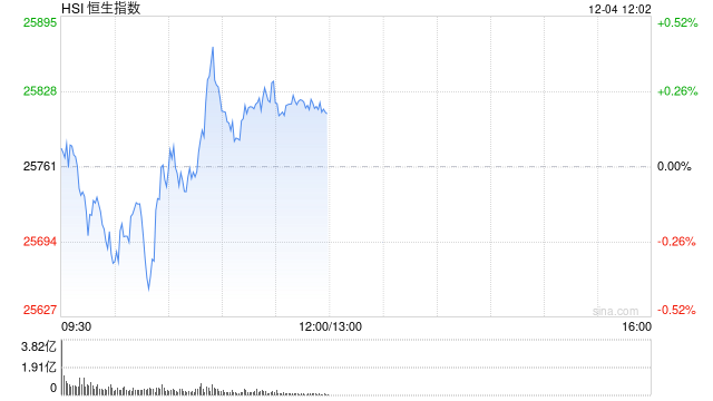 12月4日消息,港股三大指数集体上涨。截至午间收盘,恒生指数涨0.19%,报25809.45点,恒生科技指数涨0.58%,国企指数涨0.38%。盘面上,科网股涨跌不一,小米、哔哩哔哩、美团涨超2%,百度跌超0.5%;机器人概念股走强,三花智控(002050)涨超9%;半导体板块涨幅居前,英诺赛科涨超4%;创新药概念回暖,歌礼制药涨超8%。