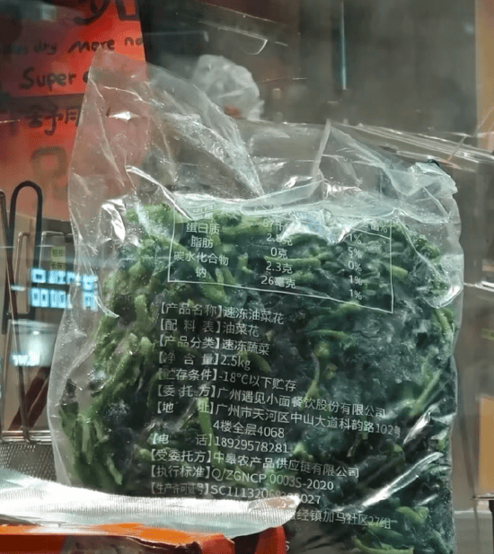 还有消费者表示,“现在全是预制菜,演都不演了”。 对于餐品是否为预制,一位遇见小面的前员工向《BUG》栏目表示属实,“80%都是预制,比如杂酱、擂椒等,一包包倒出来即用,饺子也是速冻的。”据网传图片,遇见小面中常见的配菜西蓝花也为预制包装,代工方为中皋农产品(000061)供应链有限公司。《BUG》栏目拨打了该公司电话进行核实,截至发稿前未获回应。
