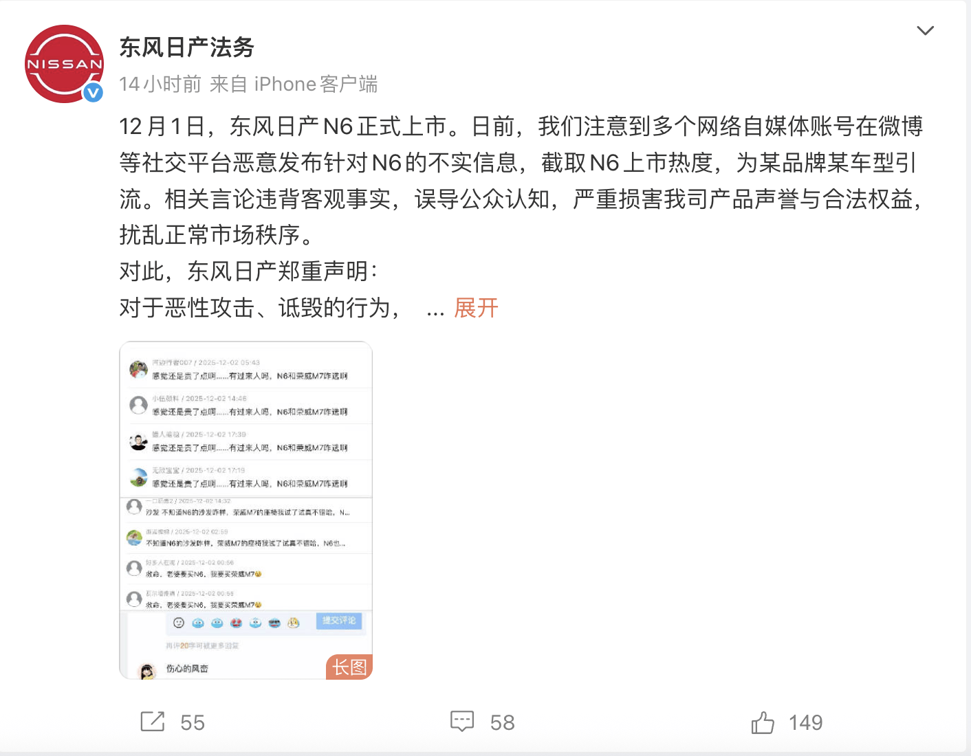 凤凰网科技讯 12月4日,东风日产法务昨日发文称,近日注意到多个网络自媒体账号在微博等社交平台恶意发布针对N6的不实信息,截取N6上市热度,为某品牌某车型引流。相关言论扰乱正常市场秩序。 对此,东风日产郑重声明:已对相关侵权言论及行为进行全面的证据收集与保全工作。针对已查证的黑公关账号及幕后操纵者,我司将坚决采取法律手段,依法追究其法律责任。