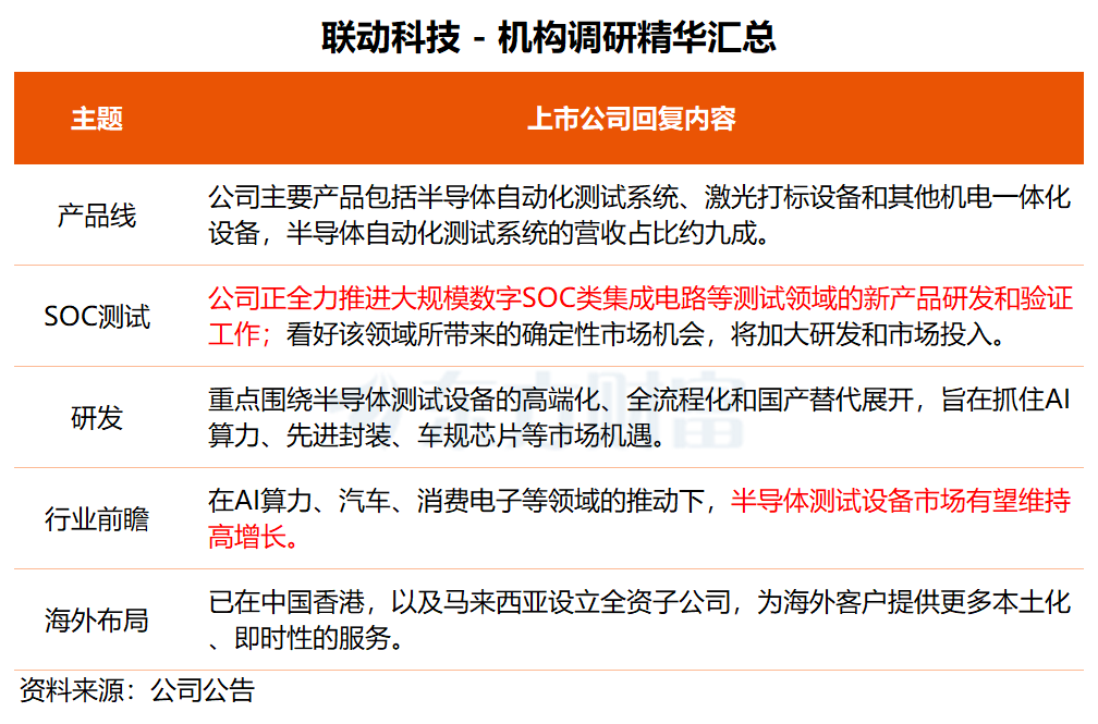 12月4日,多家上市公司发布投资者关系活动记录表公告,披露各自与机构之间的业务交流内容,其中透露出公司业务布局的诸多进展与亮点。 博杰股份:预计2026年N客户设备需求量在小四位数级别 博杰股份12月3日接受招商证券、平安基金等8家机构调研。 在调研中,博杰股份表示,今年业务比较大的增长点来自AI服务器和汽车电子的设备需求。其中,AI服务器第三季度单季度确认1亿多营收,与上半年相当。 “AI服务器测试产品每月能出货一百多台,今年主要的大客户是G客户。”博杰股份透露,公司与G客户订单金额已实现亿元,当前产品已陆续发货。 关于和N客户的合作,博杰股份称,公司今年正式进入N客户的量产线,相关设备将在明年上半年批量交付,另外还有几个项目在推进,包括后续产品各项测试站需求,如ICT、FCT功能老化都会涉及。“预计2026年N客户的设备需求量在小四位数级别。” 博杰股份还透露,公司的冷板是应用在公司的测试设备上,已小批量发货给N客户及其CM厂富士康。下一步,公司计划往机柜里做,将积极整合供应链资源实现零部件供应商的目标。 机器人业务方面,博杰股份称,当前公司主要与T客户的机器人测试需求进行对接,从imu、camera、电子皮肤力传感器到麦克风检测等,imu设备小批量发货,单台价格上百万。公司也在同步研发一些电子皮肤测试设备,现在还在实验室环节。此外,公司与T客户在汽车、robotaxi都有合作,如车载大屏检测与组装等。 ![]() 博杰股份是一家专注于智能制造领域工业自动化、智能化设备及系统解决方案的高新技术企业。今年前三季度,公司实现营收11.17亿元,同比增长35.61%;归母净利润为1.06亿元,同比大幅增长6760.54%。 华安证券研报指出,AI算力资本开支有望进入上行期,随着客户产品设计复杂度及功率的提升,其对测试产品的技术要求会很高,博杰股份作为该领域技术水平上的垂类领军企业,有望受益于客户产品更新迭代带来的业务增长。 二级市场方面,博杰股份股价今日下跌3.43%,年内涨幅为138.41%。 联动科技:正全力推进SOC测试设备研发和验证工作 联动科技近两日接受了广发证券、大兴华旗等机构调研。公司表示,在AI算力、汽车、消费电子等领域的推动下,半导体测试设备市场将会继续维持较高的增长比例。 联动科技称,公司主要产品包括半导体自动化测试系统、激光打标设备和其他机电一体化设备,目前主要业务聚焦在半导体自动化测试系统,营收占比约90%。 “公司在集中精力做好主业的同时,也一直在关注行业内合适的投资机会。”联动科技称,在合适的时机,公司会寻求产业整合度较高的标的,做一些上下游或横向并购的尝试。 关于SOC测试设备,联动科技透露,公司正在全力推进大规模数字SOC类集成电路等测试领域的新产品研发和验证工作,产品尚未量产。 联动科技指出,目前,国内高端SOC测试机国产化率比较低,基于国产替代、自主可控、降低测试成本以及AI数据中心算力和端侧AI应用的发展,公司看好该领域所带来的确定性市场机会,将加大该领域的研发和市场投入。 ![]() 资料显示,联动科技是国内领先的功率半导体测试系统供应商之一,也是少数进入国际封测市场供应链体系的中国半导体设备企业之一。 今年前三季度,公司实现营收2.33亿元,同比增长3.48%;归母净利润为1445.77万元,同比下降4.79%。 二级市场方面,联动科技股价年内上涨105.52%,昨日盘中刷新两年半以来新高,今日回调收跌1.68%。