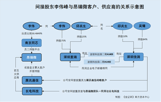 截至查询日2025年11月12日,深圳麦瑞思官网显示,麦瑞思(Wellstec)成立于2015年,是智能手机和智能手表设计ODM厂商。 同时,深圳佳润鑫官网显示,深圳佳润鑫专注于移动终端、智能穿戴解决方案,致力于打造一流的开放的ODM平台。 另外,深圳佳润鑫在公开招聘平台发布的信息显示,深圳佳润鑫专注于手机、智能穿戴ODM代工,其发布的公司相册显示,其前台背景墙上同时并排标示深圳佳润鑫、深圳麦瑞思的标识。 综上情形,深圳麦瑞思、深圳佳润鑫从事的业务或存重叠,均涉及手机及智能穿戴,两者或在同一处经营办公。 4.3 深圳佳润鑫称系展讯通信战略客户,曾与昂瑞微一同拜访长电科技 据深圳佳润鑫官网发布的内容,深圳佳润鑫获得2016年展讯通信战略客户奖。2017年8月,深圳佳润鑫获得展讯通信战略合作伙伴奖。 另外,据深圳佳润鑫官网2017年8月29日发布的关于“莅临长电科技(600584)”现场照片,江苏长电科技股份有限公司(以下简称“长电科技”)在其公司形象樯LED屏幕上播放了“热烈欢迎深圳佳润鑫&中科汉天下团队莅临长电科技”字样。 需要指出的是,2019年9月4日前,昂瑞微公司名称为“北京中科汉天下电子技术有限公司”。 即深圳佳润鑫或曾与彼时名为“中科汉天下”的昂瑞微一同拜访长电科技。 4.4 展讯通信或曾是昂瑞微主要大客户,而长电科技为昂瑞微前五供应商之一 据签署于2025年10月15日的招股书,2022年、2024年及2025年1-6月,长电科技均为昂瑞微前五大供应商,昂瑞微对其采购金额为11,476.35万元、19,797.87万元、6,151.64万元,采购内容主要为封测服务。 2022-2024年及2025年1-6月,昂瑞微披露的前五大客户未包括展讯通信。 2014年12月,昂瑞微与股东签署的投资协议,各方就股权回购权事项约定,出现下列情形之一时,权利方有权要求昂瑞微以现金方式回购权利方所持的全部或部分昂瑞微股权,列示的情形包括“2015年、2016年昂瑞微收入、净利润来源于展讯通信的部分分别大于40%、20%”。 可见,展讯通信或曾是昂瑞微的主要大客户。 简言之,2016年12月,外部投资人李伟峰通过昂瑞微员工持股平台南京同芯入股,其为南京同芯第一大合伙人。研究发现,昂瑞微间接股东李伟峰与深圳麦瑞思的控股股东李伟峰“同名”。且深圳麦瑞思与深圳佳润鑫上演经营混淆异象。其中,深圳佳润鑫官网曾披露,其为展讯通信的战略客户,并曾与昂瑞微一同拜访长电科技。而长电科技系昂瑞微前五大供应商,展讯通信则或曾是昂瑞微的大客户。在此情况下,展讯通信曾系清华大学控制的下属企业,曾于2015年3月入股昂瑞微,而后于2017年11月退股。