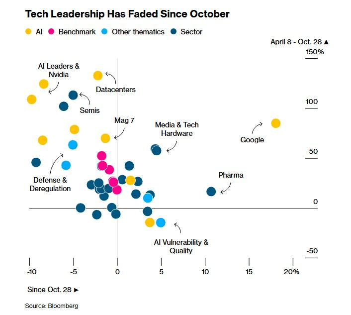 科技股不再领涨美股?机构:AI在高速扩张中把“泡沫”甩身后 全新妙想投研助理,立即体验 标普500指数重新逼近历史新高。但数据显示,美股科技股在本轮美股行情中未能一如往常成为领涨板块,市场对人工智能(AI)泡沫的担忧导致AI概念龙头股英伟达、微软等股价受到拖累。 但随着科技股、AI概念股走势落后,华尔街两大机构——贝莱德(BlackRock)和美国银行(Bank of America)近期都开始反驳“AI泡沫”论,并表示本轮AI热潮是由真正的企业投资、收益和生产率增长推动的,而非21世纪00年代互联网泡沫那样的非理性繁荣。 贝莱德投资研究所所长博威(Jean Boivin)称,鉴于AI继续以“前所未有”的规模和速度扩张,将AI热潮描述为泡沫是“不完整的”。 10月底以来领涨板块有变 根据媒体汇编数据,自10月28日标普500指数上一次创纪录收盘以来,礼来公司(Eli Lilly&Co)、红衣主教健康股份有限公司(Cardinal Health Inc.)和渤健公司(Biogen Inc.)等生物医药类企业股票跻身表现前十榜,分别上涨28%、26%和21%,生物医药板块整体录得10.7%的涨幅,领涨美股各板块。 相比之下,自10月28日以来,标普500信息技术指数同期反而整体下跌了4.2%,“美股科技股七巨头”(下称“美股七巨头”)的股票整体下跌1.3%,仅谷歌母公司Alphabet仍录得18.1%的涨幅。AI领军股英伟达跌去9.7%,AI领军企业股整体下跌8.4%,AI软件股整体下跌8.5%。 ![]() 而在4月美国总统特朗普宣布关税政策导致大幅抛售后,科技股在4月8日~10月28日期间始终领涨标普500指数的上一轮反弹。“美股七巨头”期间上涨69.8%,英伟达期间上涨108.8%。AI领军企业股整体上涨124.2%,AI软件股整体上涨67.9%。10月29日,科技板块在标普500指数中的权重还一度创下历史新高,达到约36%。 这被市场人士解读为,由于对股票高估值以及在AI算力、基础建设方面的巨额支出能否换来切实利润的担忧越发盛行,美股投资者对AI交易仍感到不安。同时,出于对美国经济整体增长的信心,以及对美联储降息押注的反弹,其他行业股票获得增长。 加拿大皇家银行资本市场策略师卡瓦斯纳(Lori Calvasina)称:“美股领涨板块的轮动已经开始。在过去几个月里,我们与机构投资者的会面中,对AI交易、美股七巨头和市场集中度的担忧情绪日渐高涨。”“七巨头”中的多只股票也陷入困境,Meta Platforms的股价自10月28日标普500指数达到峰值以来甚至已下跌14%。 “美股七巨头”中,只有Alphabet因谷歌推出的最新大模型Gemini 3,股价表现良好。目前,美股科技股估值仍接近20年区间的顶部,远期市盈率约为28倍。 尽管投资者对美股科技股和AI概念股投下不信任票,但科技企业加大对AI数据中心的支出的同时,美股科技企业在最新的财报季,也继续显示出强劲的盈利增长。卡瓦斯纳称,这可能会限制板块轮动的范围和时长,除非有某些行业领域的企业取得的利润更令人印象深刻。“其他板块要长时间持续跑赢科技股的引领地位,仍需要盈利动态的转变。”他称。 “AI泡沫论”开始遭到质疑 但美国银行和贝莱德等华尔街大型机构近期已开始质疑“AI泡沫论”,称此次AI热潮并非互联网泡沫2.0,而将继续由真正的企业投资、收益和生产率增长所推动。 博威2日在媒体圆桌会议上称:“我们认为,在现阶段,AI泡沫叙事对投资者来说没有多大用处,我们希望投资者避免把所有事情都放在一种回顾性的指标或评估上。” 贝莱德认为,AI的支出热潮如此之大,以至于它已经成为宏观经济故事本身,各行业企业在AI领域投资的规模可能会推动美国GDP增长持续高于过去几十年来主导的2%的长期趋势。贝莱德在其展望中写道:“与AI建设相关的资本支出野心如此之大,以至于(行业的)微观动态可以被视为宏观的(缩影)。”该机构估计,到2030年,全球企业AI支出计划在5万亿~8万亿美元之间。“投资者面临的挑战是:令巨额资本支出计划与潜在的AI投资回报收入相协调,令两者更匹配。” 不过,贝莱德也坦言,从计算到电网的扩建仍存在物理限制。到21世纪20年代末,人工智能数据中心可能会消耗美国15%~20%的电力,这使得AI投资扩张和数据中心扩建,既具有变革性又脆弱。但贝莱德强调,“这种前期支出对于实现最终收益是必要的”。这些压力是结构性转变的一部分,AI投资热潮仍将持续帮助推动美股创下历史新高,AI主题仍将是美国股市的主要驱动力。 富达国际全球多元资产主管奎菲(Matthew Quaife)在近期接受一财记者专访时也认为,AI投资带来的影响已经切实可见。 “AI投资及其将带来的影响是非常真实的。我举个例子,我知道有一家企业,得益于AI投资,其技术更新原本需要8个月时间完成,需要数千人对平台进行代码更新,而如今只需要不到1个月就可以完成。你要做的只是将1000万行代码加载到AI大脑中进行更新,然后你再进行测试,并对其进行大量的治理和严格管理。”他称,“我们谈论的是生产率提高了8倍,而且获得这一成果所需要投入的人力也比过去少得多。我认为在过去的6个月里,AI投资带来的变化真的已经发生。我们能看到一些非AI领域的企业都能够受益于这些变化和进展。这意味着,AI热潮是非常真实的,未来AI投资带来的改变,还可能进一步影响公司重组、生产力提升和收益等方面。” 回到那些直接与AI行业有关的企业,他认为,从长远来看,AI投资最终也会给AI企业带来正向影响。“因此,我们仍然会持有这些AI概念股,仍然偏好这一投资