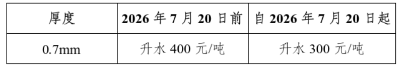 上期所发布公告,根据《上海期货交易所不锈钢期货合约》《上海期货交易所不锈钢期货业务细则》等有关规定,经研究决定,对不锈钢期货部分厚度升贴水进行调整,自2026年7月20日起执行,具体情况如下图。