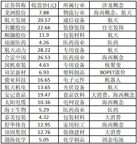 (注:创出历史新高的涨停股,说明该股人气旺盛、趋势明确,且上方无阻力,延续原上涨趋势概率较大。) 涨停板个股中,股价创出近一年新高的个股有18只(不包括创出历史新高的个股),包括龙洲股份、航天发展、名雕股份、顺灏股份、瑞康医药、航天动力、合富中国、国机重装、双星新材、骏亚科技、航天机电、安记食品、太阳电缆、海王生物、嘉美包装、舒华体育、顶固集创、渤海化学,具体如下表所示。