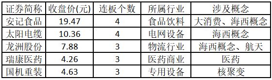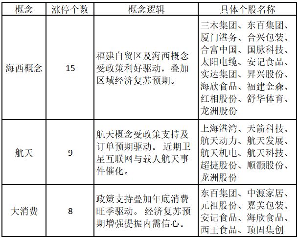 (注:行业涨停板个股越多,说明该行业被资金重点关注,是当前热门行业。) 从概念特征来看,今日涨停板个股中,海西概念、航天、大消费概念的个股最多。