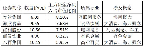 (注:主力资金净流入金额越多的涨停股,说明该股被主力资金重点关注,值得重点关注。) 主力资金净流入金额占市值比例排名前5的个股分别为实达集团、海欣食品、红相股份、闽发铝业、东百集团。