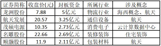 (注:主力资金净流入金额占市值比例越高的个股,说明该股被主力资金重点关注,值得重点关注。) 从封板资金来看,今日涨停板个股中,封板资金排名前5的个股包括龙洲股份、航天发展、茂硕电源、名雕股份、顺灏股份。