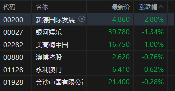 博彩股走弱,银河娱乐跌超1%。瑞银发表研究报告,对澳门博彩业明年前景看法正面,预期需求将保持强韧,丰富的旅游产品、市场推广增加及客户基础更多元化均将支持行业增长,特别看好高端需求,将今明两年澳门博彩总收入增长预测由8%及5%,提升至9%及6%,并预期博彩营运商EBITDA可增长约1%及7%。