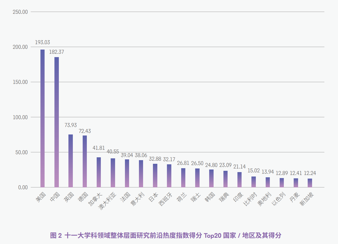 图片来源:视频截图 《2025研究前沿》报告通过跟踪全球重要的科研学术论文,研究分析论文被引用情况等方法,遴选展示了2025年全球在农业科学等11个高度聚合的大学科领域中110个热点前沿和18个新兴前沿,较为客观地反映了相关学科的发展趋势。 《2025研究前沿热度指数》在《2025研究前沿》基础上,评估世界主要国家和地区在11个学科领域的研究活跃程度,以及在这些研究前沿中的研究产出贡献和影响力表现。