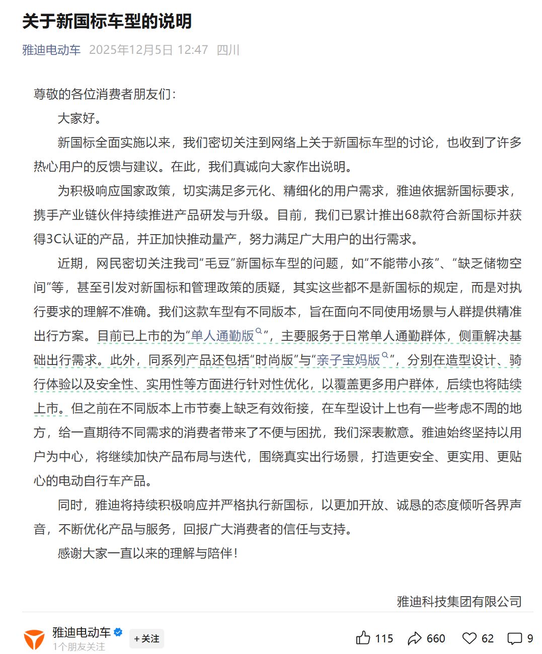 每经编辑|张锦河 12月5日,雅迪电动车发文称,新国标全面实施以来,我们密切关注到网络上关于新国标车型的讨论,也收到了许多热心用户的反馈与建议。在此,我们真诚向大家作出说明。 为积极响应国家政策,切实满足多元化、精细化的用户需求,雅迪依据新国标要求,携手产业链伙伴持续推进产品研发与升级。目前,我们已累计推出68款符合新国标并获得3C认证的产品,并正加快推动量产,努力满足广大用户的出行需求。 近期,网民密切关注我司“毛豆”新国标车型的问题,如“不能带小孩”、“缺乏储物空间”等,甚至引发对新国标和管理政策的质疑,其实这些都不是新国标的规定,而是对执行要求的理解不准确。我们这款车型有不同版本,旨在面向不同使用场景与人群提供精准出行方案。目前已上市的为“单人通勤版”,主要服务于日常单人通勤群体,侧重解决基础出行需求。此外,同系列产品还包括“时尚版”与“亲子宝妈版”,分别在造型设计、骑行体验以及安全性、实用性等方面进行针对性优化,以覆盖更多用户群体,后续也将陆续上市。但之前在不同版本上市节奏上缺乏有效衔接,在车型设计上也有一些考虑不周的地方,给一直期待不同需求的消费者带来了不便与困扰,我们深表歉意。雅迪始终坚持以用户为中心,将继续加快产品布局与迭代,围绕真实出行场景,打造更安全、更实用、更贴心的电动自行车产品。 同时,雅迪将持续积极响应并严格执行新国标,以更加开放、诚恳的态度倾听各界声音,不断优化产品与服务,回报广大消费者的信任与支持。
