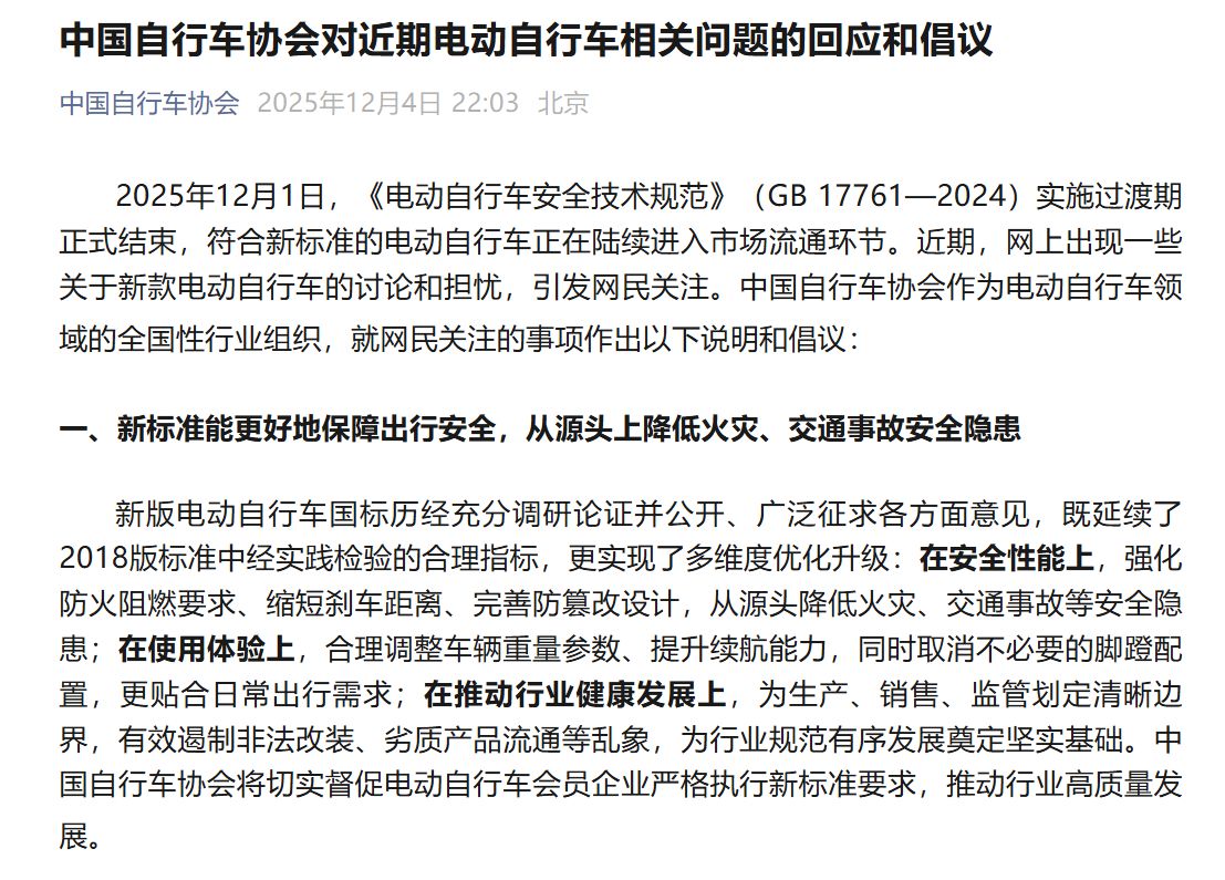 12月4日晚,中国自行车协会发文称,2025年12月1日,《电动自行车安全技术规范》(GB 17761—2024)实施过渡期正式结束,符合新标准的电动自行车正在陆续进入市场流通环节。近期,网上出现一些关于新款电动自行车的讨论和担忧,引发网民关注。中国自行车协会作为电动自行车领域的全国性行业组织,就网民关注的事项作出以下说明和倡议: 一、新标准能更好地保障出行安全,从源头上降低火灾、交通事故安全隐患 新版电动自行车国标历经充分调研论证并公开、广泛征求各方面意见,既延续了2018版标准中经实践检验的合理指标,更实现了多维度优化升级:在安全性能上,强化防火阻燃要求、缩短刹车距离、完善防篡改设计,从源头降低火灾、交通事故等安全隐患;在使用体验上,合理调整车辆重量参数、提升续航能力,同时取消不必要的脚蹬配置,更贴合日常出行需求;在推动行业健康发展上,为生产、销售、监管划定清晰边界,有效遏制非法改装、劣质产品流通等乱象,为行业规范有序发展奠定坚实基础。中国自行车协会将切实督促电动自行车会员企业严格执行新标准要求,推动行业高质量发展。 二、减少误读和曲解,宽容看待行业升级的适配期 新标准发布以来,各电动自行车会员企业大力推进符合新标准车型的设计、生产工作,目前,全国已有100余家企业的600余款新标准车型通过CCC认证,涵盖高中低等不同档次车型的消费需求。近期网络上出现的讨论和热议,反映出广大消费者对新标准产品的关注和期待,但个别企业对新标准产品的生产准备不充分、宣传解释不到位,造成有些网民的误读误解。 如关于“铁皮座椅”问题,当前主流车型均采用发泡材料(海绵)座椅,既满足安全标准,又保障骑行舒适度,网传“铁皮座椅”仅为极个别企业未充分考虑消费者骑行感受,采用不合常理的设计方案,并不是行业普遍现象,更不是新标准要求的。 关于“不能带小孩”问题,目前企业已经研发出的新标准产品中,70%以上车型均有后衣架(后座),能够满足亲子出行需求,少数车型因定位单人骑行而未设计后衣架,消费者可根据需求自主选择适配车型。 关于“超速会急刹”问题,新车型在达到25km/h时只是不能再继续提速,不会紧急制动,经过前期反复测试验证和试驾,以及近期新用户体验,行驶过程平顺,可较好满足消费者的出行需求和安全保障。 关于“禁止安装后视镜”,新标准中不但没有“禁止安装”,而且还明确规定“鼓励安装后视镜”,目前大部分车辆出厂时均附带了后视镜,只有少部分车型出于外观简洁等考虑未安装后视镜,消费者可根据自己的使用习惯选购合适的产品。 我们也清醒认识到,标准切换是系统性工程,生产工艺的优化完善、销售渠道的适配等都需要一定适应阶段和过程。目前,全行业正处于车型设计试制、产业链调整完善的关键阶段,我们将推动企业持续优化产品外观和功能,后续会陆续推出更实用、更舒适、更安全、更符合老百姓出行需求的车型,也恳请广大消费者多提意见建议,促进行业整体安全和质量水平提升。 三、多方协同发力,共筑良好产业生态 为推动新标准平稳落地,协会将联合全产业链共同发力,并向行业各环节相关主体发出以下倡议: 龙头骨干企业要发挥示范引领作用,严格遵守新标准各项要求,在保障安全合规的前提下,持续关注消费者实际需求,优化产品设计与性能、提升用户体验;要建立健全与经销商、门店的信息同步机制,提前告知生产排期、上市计划及产品核心参数,确保终端能及时准确传递信息,避免产生信息不对称和误读;要加大研发投入,加快推出更多高性价比、适配多元场景的车型,丰富消费者选择空间。 经销商和门店要严格执行销售合规要求,主动向消费者宣传新标准车辆的性能特点,如实介绍产品参数、价位区间,耐心解答“能否带娃”“车型适配”“续航能力”等问题,引导消费者按需选购,坚决杜绝虚假宣传、违规销售和非法改装。 行业媒体要坚持客观公正、实事求是,聚焦新标准优势、产品选购技巧、使用常识等内容开展科普解读,针对热点疑问及时发声澄清;要坚决抵制不实信息,不转发、不扩散非法改装电动自行车、电池等相关内容,主动传播行业正能量,共同营造清朗的舆论环境。 同时,协会将进一步深化标准宣贯培训,在相关部门的指导下,联合检测、认证等机构开展多场次解读活动,帮助企业准确执行新标准;搭建技术交流与资源对接平台,推动企业共享防火阻燃、防篡改等关键技术成果,降低转型成本;持续向相关部门反映行业共性问题与诉求,推动行业健康有序发展。 安全是发展的前提,发展是安全的保障。电动自行车作为近4亿用户绿色、便捷的短途出行工具,涉及千家万户日常工作生活。我们呼吁社会各界秉持理性、宽容理念,多提建设性意见,不信谣、不传谣,与电动自行车企业一道践行新标准、拥抱新变革,共同构建安全、规范、创新、可持续的产业生态,为建设制造强国、满足人民美好生活需要贡献更大的力量!