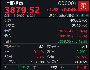 每经记者|刘明涛 每经编辑|彭水萍 12月4日,A股震荡攀升,截至上午收盘,上证指数涨0.04%报3879.52点,深证成指涨0.35%,创业板指涨0.76%,北证50涨0.23%,科创50涨0.92%,中证A500涨0.33%,A股半日成交1.04万亿元。