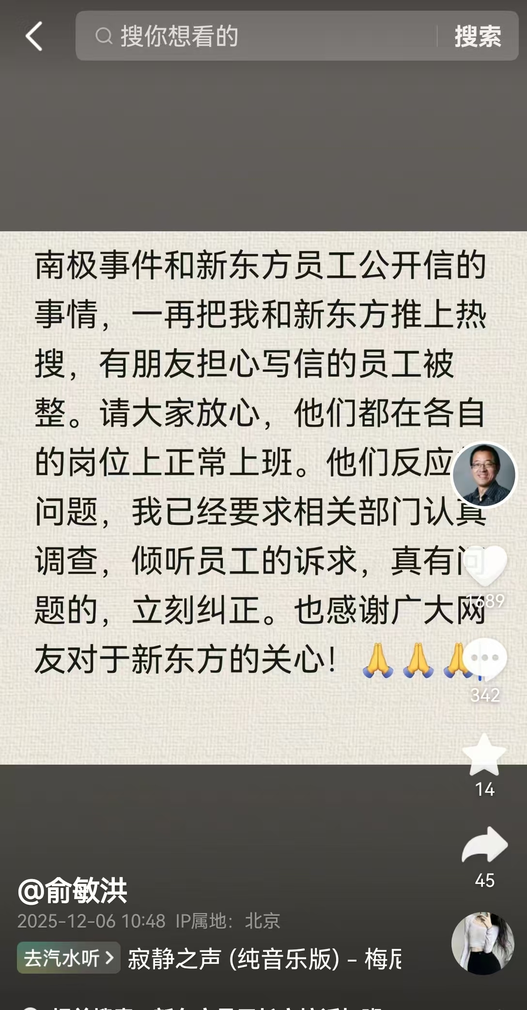 每经编辑|杜宇 12月6日,新东方集团董事长俞敏洪发文称,南极事件和新东方员工公开信的事情,一再把我和新东方推上热搜,有朋友担心写信的员工被整。请大家放心,他们都在各自的岗位上正常上班。他们反映的问题,我已经要求相关部门认真调查,倾听员工的诉求,真有问题的,立刻纠正。