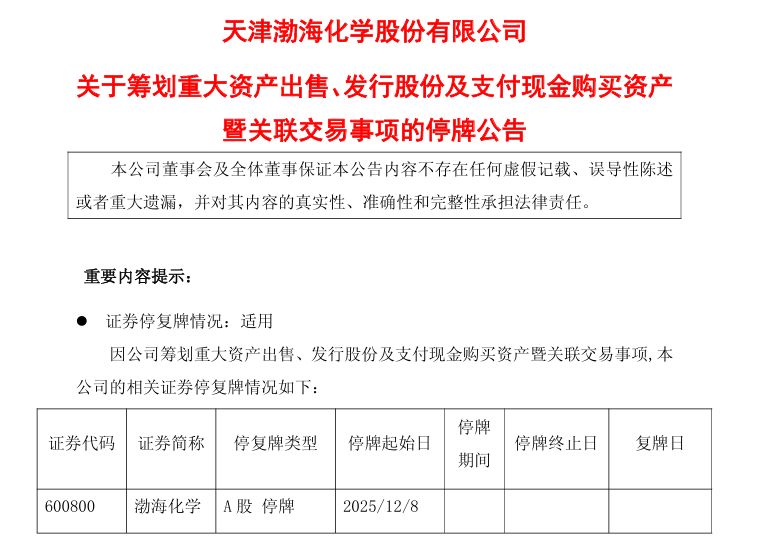 根据初步测算,本次交易可能构成《上市公司重大资产重组管理办法》规定的重大资产重组。本次交易不涉及公司发行股份,不构成关联交易,也不会导致上市公司控制权的变更。 公告称,本次拟收购项目采用公开竞价方式,受公开竞价的市场化竞争属性及外部环境多变性等综合因素影响,公司能否成功摘牌存在较大的不确定性。参与摘牌需要缴纳保证金1亿元,若公司成功摘牌但后续审批流程未能通过,公司存在损失保证金的风险。 公告还称,本次交易尚处于初步筹划阶段,目前交易双方尚未签署任何相关协议,交易方案等核心要素仍需进一步论证和协商,尚需履行公司、标的公司及交易对方必要的内外部相关决策、审批程序,存在未能通过该等决策、审批程序的风险。 根据交易对方在山东产权交易中心公开披露的标的公司主要财务数据,山东达驰电气有限公司2025年1—10月份的净利润为亏损3083.15万元,山东达驰高压开关有限公司2025年1—10月份的净利润为亏损1413.75万元。标的公司主营高压变压器和高压开关的研发、生产、销售,主要客户为国网及行业大客户,与公司同属于电力行业。本次收购是公司基于业务发展需要进行的同产业链并购,通过本次交易公司将取得标的公司的控制权,从而进一步丰富公司产品品类,填补公司产品在高压领域的空白,通过发挥协同效应有利于提升公司产品市场占有率及业务规模,增强公司综合竞争能力,符合上市公司发展战略。 根据《上市公司股票停复牌规则》《深圳证券交易所上市公司自律监管指引第6号——停复牌》的相关规定,本次筹划事项公司股票不停牌。 12月5日,中能电气收盘大涨12.76%。 公司官网显示,中能电气创建于1999年,公司资产规模超20+亿元,是全国领先的能源互联网解决方案提供商之一。 中能电气用20余年的专业追求,专注电力技术,逐步发展成为大型现代化企业集团,旗下拥有多家全资及控股子公司,员工总数1000余人,获得100多件专利和计算机软件著作权、参与多项国家和行业标准制定。 10月22日,中能电气发布2025年三季报。报告显示,公司前三季度营业收入为9.57亿元,同比下降4.30%;归母净利润为511.24万元,同比增长223.05%;扣非归母净利润为638.40万元,同比增长167.57%;基本每股收益0.01元。 渤海化学宣布重大资产重组,下周一起停牌渤海化学(600800.SH,股价5.05元,市值56.06亿元)发布公告称,公司正在筹划向控股股东天津渤海化工集团有限责任公司(以下简称“渤化集团”)出售天津渤海石化有限公司(以下简称“渤海石化”)100%股权,并通过发行股份及支付现金的方式购买安徽泰达新材料股份有限公司(以下简称“泰达新材”)的控制权。本次交易预计构成重大资产重组,不会导致实控人变更,不构成重组上市。