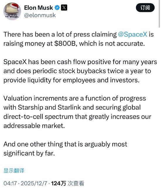 埃隆?马斯克于周六否认 SpaceX 正以 8000 亿美元估值融资,但未回应关于该公司计划出售内部股份的报道。 马斯克在其社交媒体平台 X的一篇帖子中表示:“SpaceX以8000亿美元估值融资的消息并不准确。SpaceX 多年来一直保持现金流为正,且每年会定期进行两次股票回购,为员工和投资者提供流动性。估值的提升取决于星舰(Starship)和星链(Starlink)的推进进展,以及获得全球直连手机网络的频谱,这将大幅扩大公司可服务市场的规模。”
