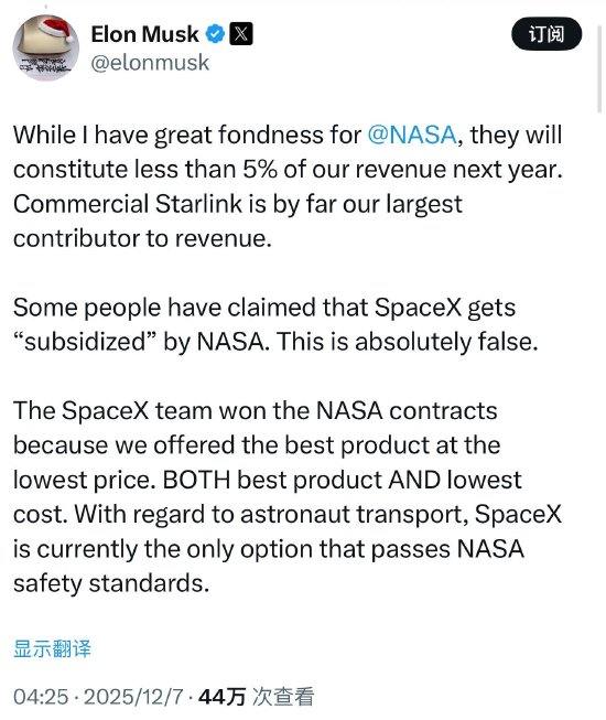 马斯克进一步表示,相比于8000亿估值,还有一件事更加重要。 他接着回复道:“我个人非常敬重NASA,但明年他们在我们总收入中的占比不会超过5%。商业化的Starlink仍然是我们收入贡献最大的一块。外界有些说法认为SpaceX是靠NASA‘补贴’起来的,这种说法是完全错误的。SpaceX能拿下NASA的合同,是因为我们既能提供性能最好的产品,又能做到最低的成本――两者同时做到。在宇航员运输业务上,SpaceX目前是唯一通过NASA安全标准的方案。”