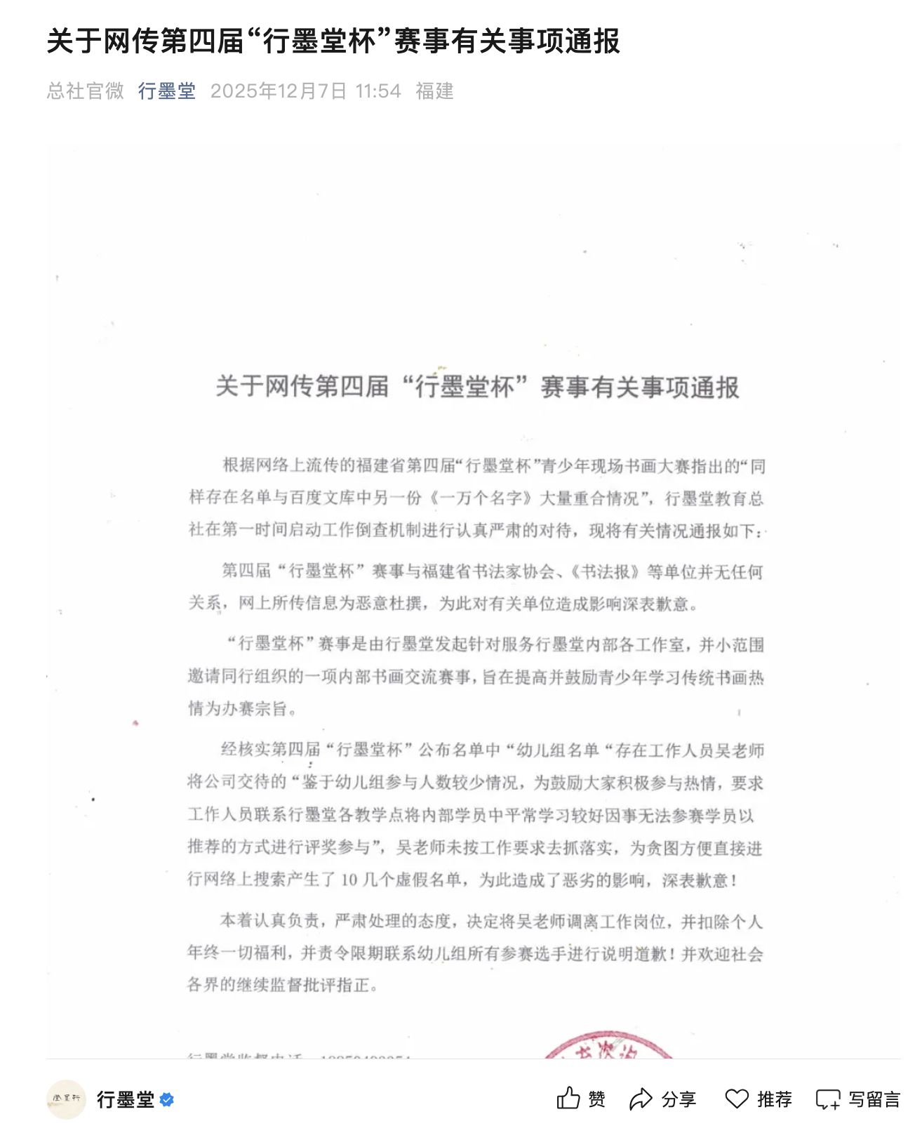 有网友指出,第四届“行墨堂杯”青少年现场书画大赛获奖名单中,硬笔幼儿组金奖6人,除第一名郑某某外,后续“杨怡伶、林亚蓉、李家伟、陈皓茜、杨郁婷”5人名字、顺序与2019年12月百度文库中的《一万个名字》开头5人完全相同。银奖12人,除前3人外,后续“李彦志、张雅玫、郭育维、吴兰木、江松兰、吴淑霞、许育海、赖雅婷、谢宜恩”也与上述《一万个名字》中人名和顺序完全相同。该获奖名单真实性受到质疑。 12月7日,上述书画大赛主办方行墨堂教育咨询有限公司发布通报,公开回应此事。该公司称,经核实,因赛事中幼儿组参与人数较少,为鼓励大家积极参与,公司要求工作人员联系各教学点,将部分学习较好但因事无法参赛的学员以推荐的方式参赛评奖。“但工作人员吴老师却未落实工作要求,为贪图方便,直接通过网络搜索的方式产生了十几个虚假名单,因此造成了恶劣影响。” 对此,该公司决定将吴老师调离工作岗位,扣除个人年终一切福利,并责令限期联系幼儿组所有参赛选手进行说明道歉。 涉事公司声称,第四届“行墨堂杯”赛事与福建省书法家协会、《书法报》等单位并无任何关系,网上所传信息为恶意杜撰,为此对有关单位造成的影响深表歉意。
