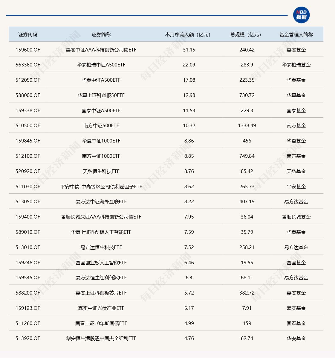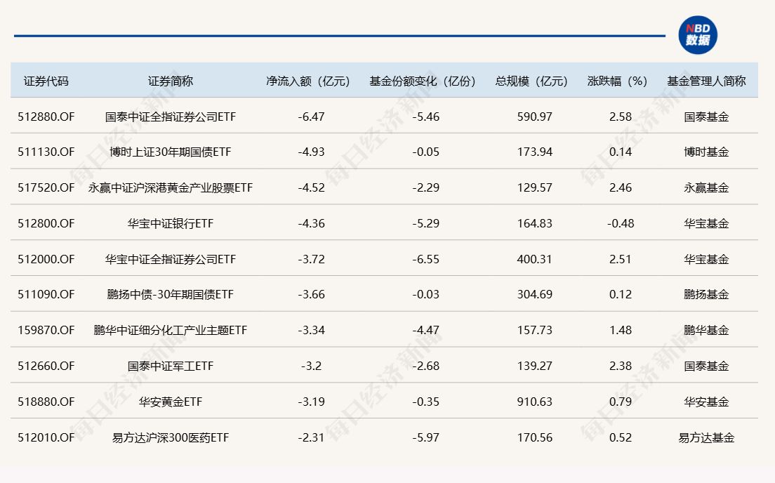 与此同时,国泰中证全指证券公司ETF份额减少5.46亿份,对应净流出6.47亿元;博时上证30年期国债ETF份额减少0.05亿份,录得净流出4.93亿元;永赢中证沪深港黄金产业股票ETF份额减少2.29亿份,出现净流出4.52亿元。 截至12月5日,本月资金净流入额居前20的ETF名单如下: