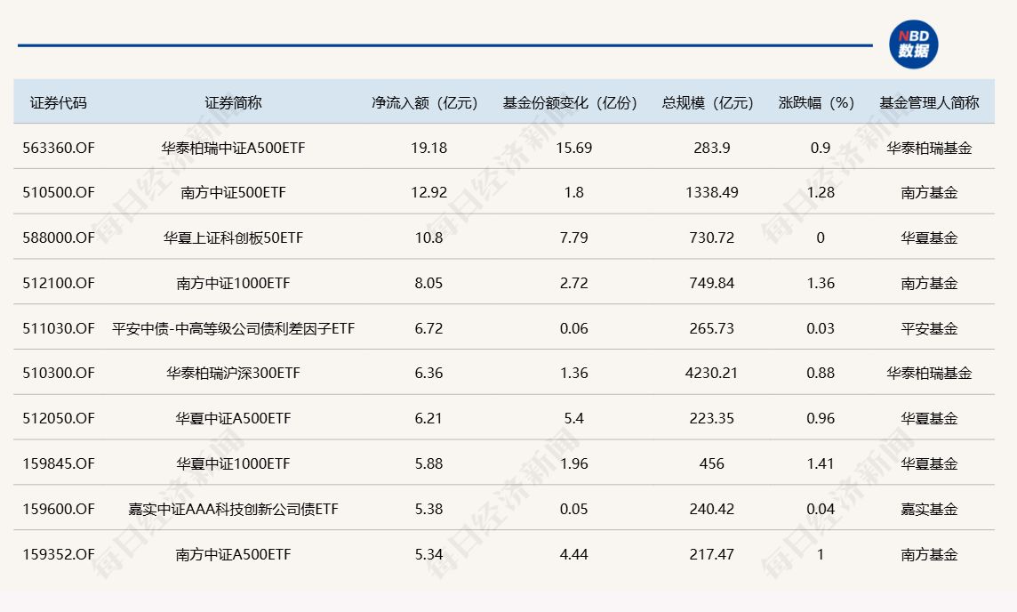 每经记者|肖芮冬 每经编辑|赵云 上周五市场探底回升,创业板指涨超1%,早盘一度跌超0.5%。板块方面,保险、贵金属、福建、商业航天等板块涨幅居前,银行、中药、影视院线等板块跌幅居前。 Wind数据显示,在12月5日的非货币ETF市场中,华泰柏瑞中证A500ETF份额增加15.69亿份,实现净流入19.18亿元;南方中证500ETF增加1.80亿份,对应净流入12.92亿元;华夏上证科创板50ETF份额增加7.79亿份,带来净流入10.80亿元。