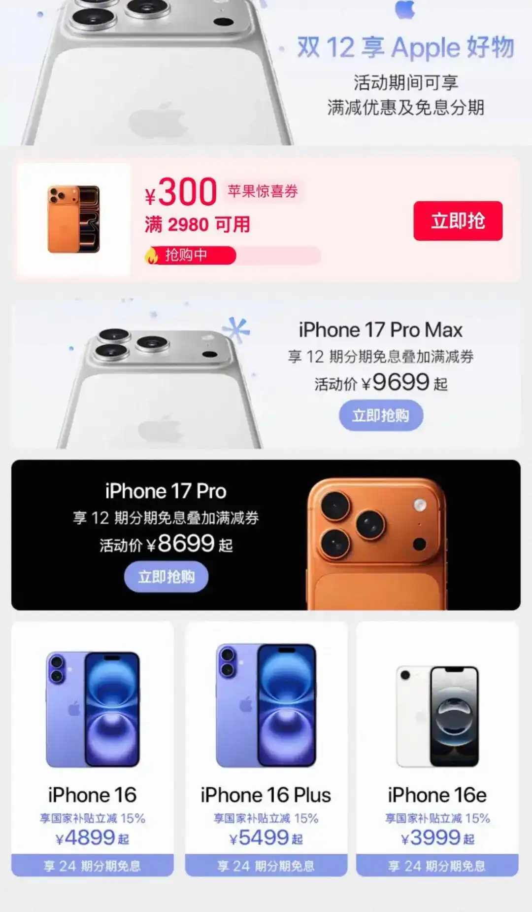 每经编辑|毕陆名 今日,Apple Store官方旗舰店在电商平台推出年末降价活动,iPhone 17 Pro及iPhone 17 Pro Max机型降价300元,降价后iPhone 17 Pro售价8699元起,iPhone 17 Pro Max售价9699元起。
