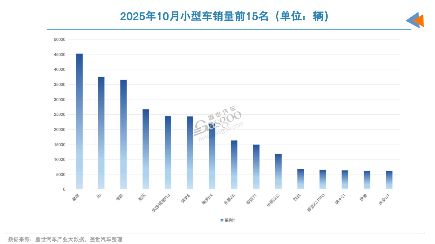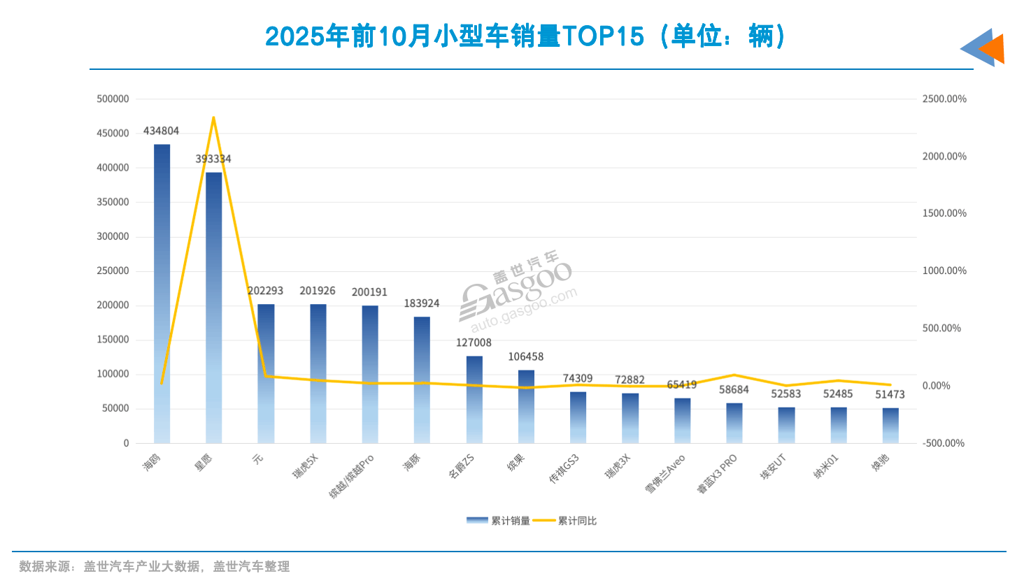 但也是这一年,小型车市场又来一强力“新人”――吉利星愿。去年10月,星愿上市,仅用数月便闯入主流小型车榜单。到2025年,吉利星愿前10月累计销售39.3万辆,并在8月以4.8万辆的销量登顶小型车市场销量冠军。 星愿的市场表现,源于其对用户需求的多维度满足。产品层面,基于GEA架构打造的星愿实现了85%的“得房率”,以A0级尺寸提供了越级的乘坐空间,并配备70L前备箱与10L副驾抽屉,拓展了实用性能。同时,在安全性、智能化方面,该车也有较强竞争力,拥有5纵8横传力结构、ACC、FVD前车驶离提醒功能等。 可以看到,小型车市场的竞争从来没有放松的时候。2025年以来,除现有头部车型外,部分新进入者亦值得关注。如定位10万元以上的蔚来萤火虫,凭借差异化服务生态与品牌认知,逐步吸纳注重品牌与服务体验的用户群体。据盖世汽车产业大数据显示,该车型在10月销量已攀升至5900辆,11月首次突破6000辆。