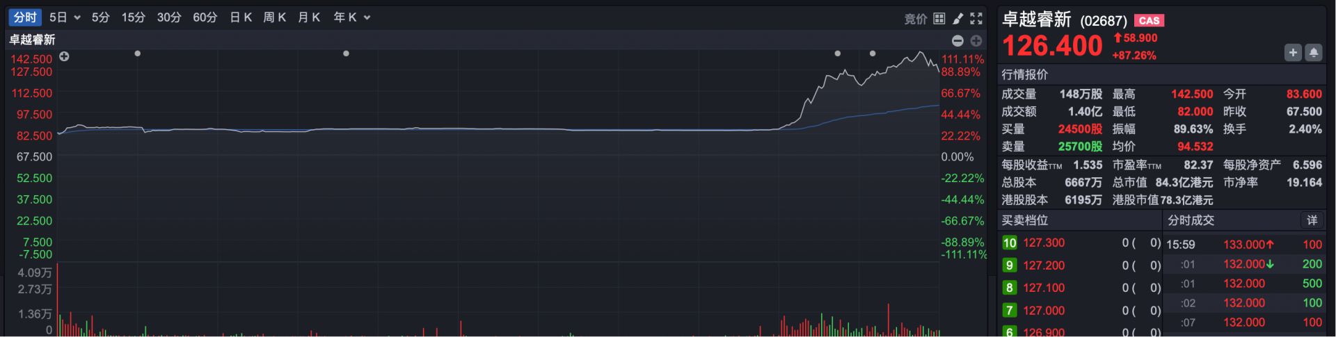 新股方面,今日两只新股同时上市,但表现差异巨大。 其中,卓越睿新(HK02687)早盘表现温和,涨幅控制在30%以内,但下午3点之后突然快速拉升,最大涨幅一度超111%,最终收盘涨超87%。