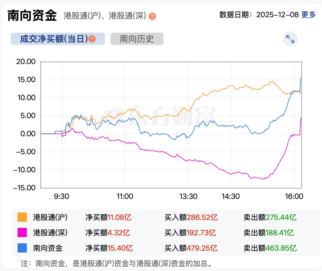 其他方面,恒生指数成分股中百度集团涨超3%,华虹半导体涨超4%,中芯国际涨超2%。泡泡玛特跌超8%,老铺黄金、信达生物跌超6%。银行股集体走低,建设银行跌超4%,招行、工行跌超3%;中资券商股普涨,华泰证券涨超4%。 资金方面,截至收盘,南向资金累计净买入港股超15亿港元。