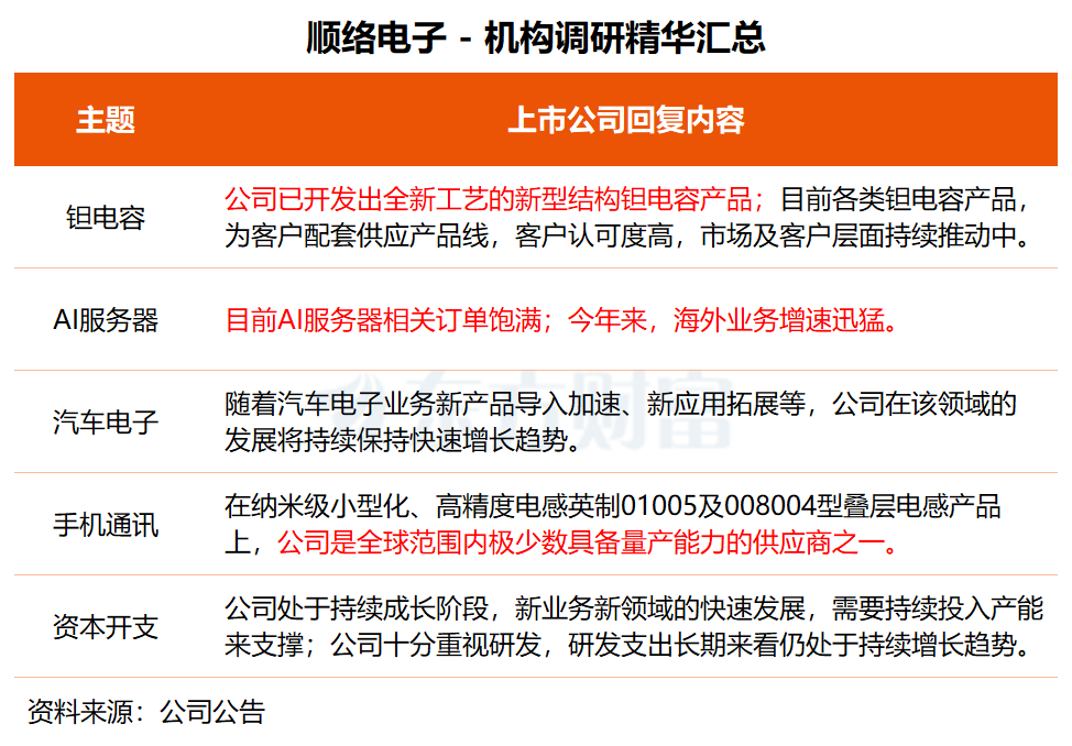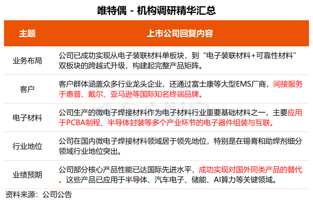 12月8日,多家上市公司发布投资者关系活动记录表公告,披露各自与机构之间的业务交流内容,其中透露出公司业务布局的诸多进展与亮点。 唯科科技:MPO产品已开始实现小批量供货康普集团 唯科科技日前接受开源证券、西部利得基金、创富兆业等机构调研,详细介绍了公司与重要客户之间的合作进展。 唯科科技表示,公司和全球无框力矩电机知名企业尼得科、科尔摩根、THOMSON LINEAR均是长期合作的客户,公司主要为其供应机器人电机绝缘端部、齿轮马达和外壳等产品,且已实现批量化销售。 康普集团是唯科科技的重要客户,公司称,自去年下半年开始,已陆续承接一些康普集团在AI服务器上的新项目,如MPO光纤连接头零部件和适配器等,并在四季度开始实现小批量供货。 “今年公司快速加大了越南和马来西亚的产能布局,目前海外产能已超30%,已形成核心产能国内研发、全球产能配套国际化布局。”唯科科技透露,部分非公司客户且不具备海外供应链的跨境电商,已积极接洽公司并实现部分大批量订单。 关于2026年利润增长目标,唯科科技称,公司内部业绩目标一般为同比增长20%,增长领域预计主要为新能源、电子机器人、医疗等板块。 ![]() 唯科科技是国内领先、国际知名的精密注塑模具企业之一,致力为汽车、小家电、户外家居、电子、机器人等制造企业提供优质的产品与服务。 今年前三季度,公司实现营收和归母净利润分别为16.8亿和2.22亿元,同比分别增长25.45%和25.20%。 开源证券研报指出,MPO是数据中心的关键元器件,需求景气度高。公司绑定康普,考虑到后者未来对MPO产品需求较高,公司有望加速相关业务放量。此外,材料轻量化作为机器人轻量化重要方式,其中以PEEK为代表的工程材料正助力机器人的性能提升。 财信证券也认为,公司在注塑领域的深厚积累,能够助力公司在人形机器人领域的业务开拓。 顺络电子:AI服务器订单饱满 相关业务快速增长 顺络电子近日接受华金证券、建信资管等15家机构调研,谈及公司在AI服务器、手机通讯等业务进展。 “公司已开发出全新工艺的新型结构钽电容产品,可广泛应用于高端消费电子、AI数据中心、企业级ESSD等领域。”顺络电子表示,目前公司各类钽电容产品,为客户配套供应产品线,客户认可度高,市场及客户层面持续推动中。 顺络电子介绍,公司为各类AI服务器类客户提供一站式元器件解决方案,客户已覆盖国内头部服务器厂商及海外头部功率半导体模块厂商。“目前公司AI服务器相关的订单饱满,相关业务快速增长(今年来,海外业务增速迅猛)。” 在手机通讯应用领域,顺络电子称,公司高精度叠层信号产品,行业地位和市场占有率多年持续保持优势地位。在纳米级小型化、高精度电感英制01005及008004型叠层电感产品上,公司是全球范围内极少数具备量产能力的供应商之一。 顺络电子还指出,公司处于持续成长阶段,新业务新领域的快速发展,需要持续投入产能来支撑,研发支出长期来看也将持续增长。 ![]() 公司前三季度实现营业总收入50.32亿元,同比增长19.95%;归母净利润为7.69亿元,同比增长23.23%。 招商证券研报指出,建议关注公司电感等业务在AI端侧的潜在价值增量,同时关注汽车、数据中心、精细陶瓷等新兴业务的发展潜力。 中原证券表示,顺络电子在AI+应用、汽车电子、数据中心等新兴战略市场实现了持续的高速增长,未来几年数据中心业务将进入快速发展通道。 唯特偶:公司部分核心产品已成功实现国产替代 唯特偶上周五举行线上会议,与中信证券、海南纵帆私募等机构进行交流,公司表示,通过“外引内研”持续发力,公司已成功实现从电子装联材料单板块,到“电子装联材料+可靠性材料”双板块的跨越式升级,构建起完整产品矩阵。 据唯特偶介绍,公司客户群体涵盖众多行业龙头企业,包括中兴通讯、格力电器、通威股份、比亚迪、大疆、三星、小米、海康威视等。公司还通过富士康等大型EMS厂商,间接服务于惠普、戴尔、亚马逊等国际知名终端品牌。 公司生产的微电子焊接材料作为电子材料行业的重要基础材料之一,主要应用于PCBA制程、精密结构件连接、半导体封装等多个产业环节的电子器件组装与互联,并最终广泛服务于消费电子、LED、智能家电、通信、计算机、工业控制、光伏、汽车电子、安防等多个行业。 唯特偶表示,公司通过持续加大研发投入,部分核心产品性能已达到国际先进水平,成功实现对国外同类产品的替代。这些产品已应用于半导体、汽车电子、储能、新能源、AI算力等关键领域。 ![]() 唯特偶是国内电子装联材料龙头企业,公司在国内微电子焊接材料领域居于领先地位,特别是在锡膏和助焊剂细分领域行业地位突出。 今年第三季度,唯特偶实现营收3.96亿元,同比增长19.67%;归母净利润为2735.17万元,同比增长15.98%。 浙商证券研报指出,唯特偶积极打造可靠性材料产品矩阵,新能源和数据中心消防材料有望快速起量。同时,公司深度受益于微电子焊接材料国产替代,从国产替代到走向全球,电子装联材料业务有望快速增长。