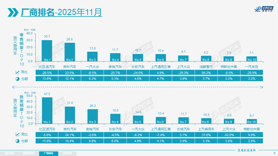 图片来源:乘联分会 11月新能源车在国内总体乘用车的零售渗透率59.3%,同比增长7%。在11月国内零售中,自主品牌中的新能源车渗透率79.6%。 细分板块中,自主品牌新能源车零售份额67.5%,同比下降5.9%;主流合资品牌新能源车份额3.2%,同比下降0.14%;新势力份额22.1%,小鹏汽车(XPEV.US)、零跑汽车(09863.HK)、小米汽车等品牌拉动新势力份额同比增长5.9%;特斯拉份额占5.5%,同比下降0.3%。 政策退坡导致销量增速放缓 2025年国内车市零售累计增速从1月―2月增长1.2%,3月―6月增长15%,7月―9月增速徘徊在6%左右,10月―11月回落到偏低状态,第4季度呈减速特征。 乘联分会秘书长崔东树表示,2025年调节增速的重要政策是以旧换新补贴。截至10月22日,2025年汽车以旧换新补贴申请量突破千万辆。随着各地补贴的大面积暂停,11月的日均补贴规模降到3万辆,增速调节效果明显。 “不出海就出局”趋势明显 2025年下半年以来,由于海外销售利润较高,中国汽车出口局面持续向好,自主新能源的海外市场认可度不断提升。中东和发达国家市场呈现高质量发展的局面,海外营销网络快速扩张,部分海外市场增长良好,成为头部车企发展的重要方向。随着平行出口新政即将实施,2025年的0公里二手车平行出口热情很高,与平行进口的低迷形成鲜明反差。 数据显示,11月海关汽车出口81.8万台,环比降1%、同比增40%。其中,自主品牌出口52.5万辆,同比增长52%、环比增长9%;合资与豪华品牌出口7.6万辆,同比增长54%;新能源车占出口总量的47.3%,较上年同期提升2.3个百分点。 汽车行业利润率处于偏低水平 从数据来看,汽车行业利润空心化趋势十分严峻,上游环节利润分流明显。乘联分会数据显示,今年1月―10月,汽车行业整体利润率为4.4%,相对于下游工业企业利润率6%的平均水平,处于偏低区间。 崔东树分析称,今年各地大力度推动“两新”政策落地实施,有效释放内需活力,消费品以旧换新政策加力扩围效果明显,但汽车行业效益改善明显落后于其他消费品。 随着国家反内卷工作持续推进,有色金属矿采选业利润率超30%,上游钢铁行业利润大幅改善,电池行业盈利丰厚,叠加智能驾驶技术的高成本投入,导致汽车行业利润持续收缩,而产业链上游企业利润表现亮眼。 (责任编辑:王治强 HF013)