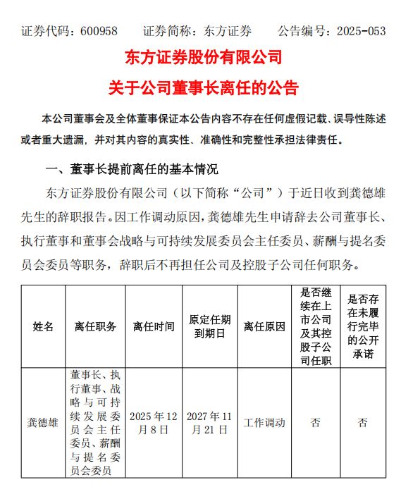 每经记者|王海慜 每经编辑|叶峰 12月8日下午,东方证券发布公告,公司董事长龚德雄因工作调动原因申请辞去董事长、执行董事等职务,辞职后不再担任公司及控股子公司任何职务。 关于市场高度关注的龚德雄调任去向,此前已有较为明确信号。今年11月14日上海市市管干部任职前公示显示,56岁的龚德雄作为申能(集团)有限公司副总经理,拟提名任市管企业经理班子正职。申能集团是东方证券第一大股东,此次调动被业内解读为国资系统内部对优秀金融管理人才的重要任用。 调任去向已明确:拟升任市管企业正职 近期关于东方证券董事长龚德雄即将离职的传闻终于尘埃落定。 今日收盘后,东方证券发布公告称,"于近日收到龚德雄先生的辞职报告。因工作调动原因,龚德雄先生申请辞去公司董事长、执行董事和董事会战略与可持续发展委员会主任委员、薪酬与提名委员会委员等职务,辞职后不再担任公司及控股子公司任何职务。"此次离任距离龚德雄2024 年11月正式就任董事长一年有余,原定任期至2027年11月。