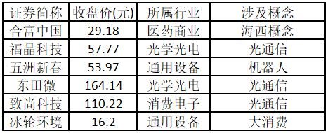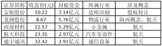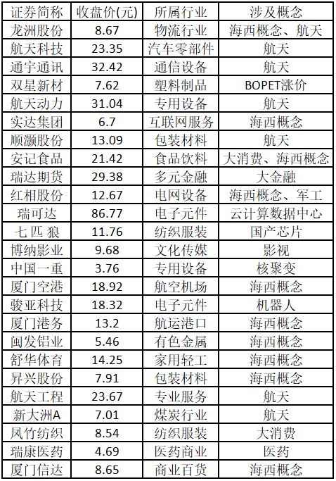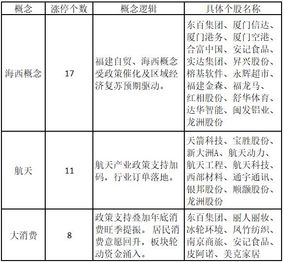 (注:行业涨停板个股越多,说明该行业被资金重点关注,是当前热门行业。) 从概念特征来看,今日涨停板个股中,海西概念、航天、大消费概念的个股最多。
