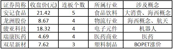 (注:封板资金越多的个股,说明该股被资金追捧,其延续上涨概率较大。) 从连板情况来看,今日首板个股有48只;2连板的个股有20只;3连板及以上的个股有6只。今日连板数排名前5的个股包括安记食品、龙洲股份、骏亚科技、瑞康医药、双星新材,具体如下表所示。