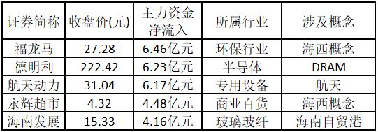 (注:创出近一年新高的涨停股,说明该股走出重要突破行情,值得重点关注。) 从主力资金来看,今日涨停板个股中,主力资金净流入金额排名前5的个股分别为福龙马、德明利、航天动力、永辉超市、海南发展。