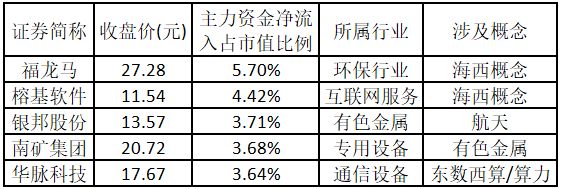 (注:主力资金净流入金额越多的涨停股,说明该股被主力资金重点关注,值得重点关注。) 主力资金净流入金额占市值比例排名前5的个股分别为福龙马、榕基软件、银邦股份、南矿集团、华脉科技。