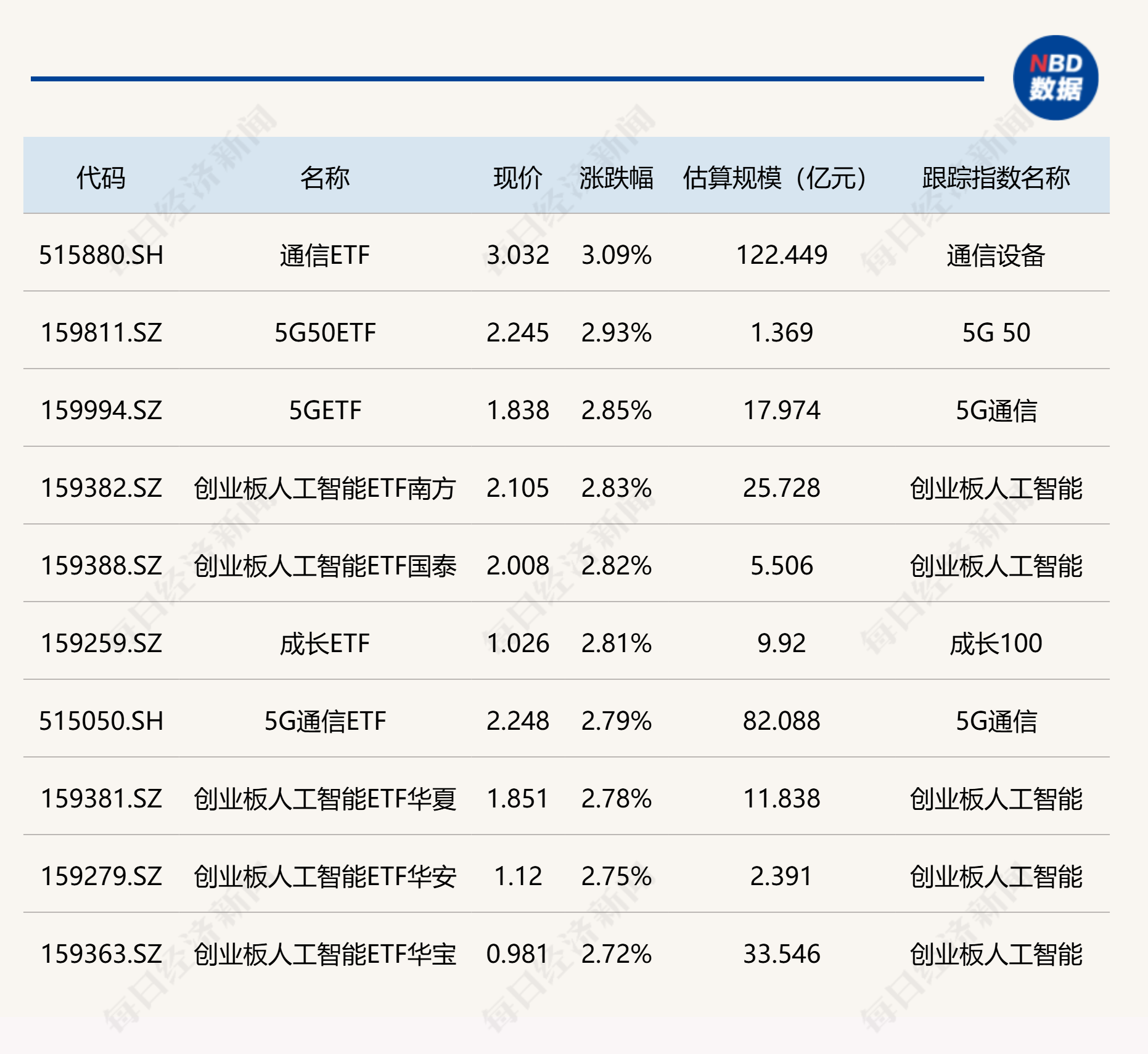有券商表示,AI可能是自云计算以来最大的产业机会。从硬件层面看,除GPU保持较快增速之外,ASIC可能在明年成为第二增长引擎,北美算力产业链条业绩有望在后续几个季度保持较高增速。从需求端看,北美云厂商云收入增长和资本开支投入形成共振,人工智能闭环清晰,发展仍处上升通道。 当前AI趋势明确,国内外云厂商资本开支高增,通信板块作为“卖铲子”的算力行业,市场规模有望持续增长。 下跌方面,有色金属相关ETF跌超3%。