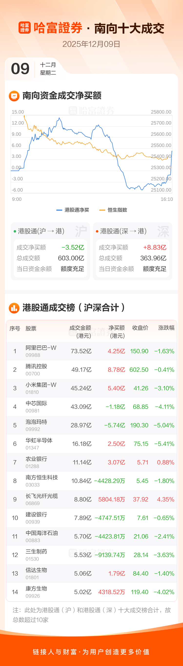 恒生指数12月9日跌1.29%,收报25434.23点。南向资金今日净买入港股5.31亿港元。南向资金今日成交额966.95亿港元,港股大市成交2102.36亿港元。