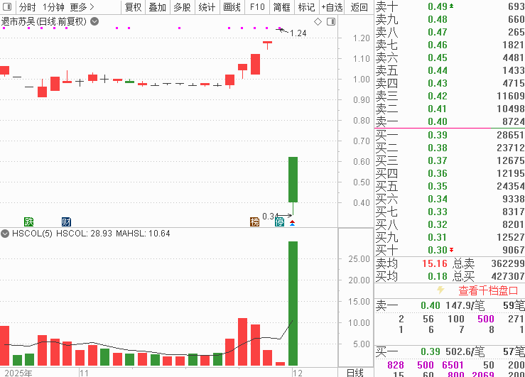 每经记者|闫峰峰 每经编辑|吴永久 12月9日,退市苏吴在复牌首日(曾用名*ST苏吴)股价大跌67.74%。消息面上,公司在2025年11月25日收到上海证券交易所《关于拟终止股票上市的事先告知书》。