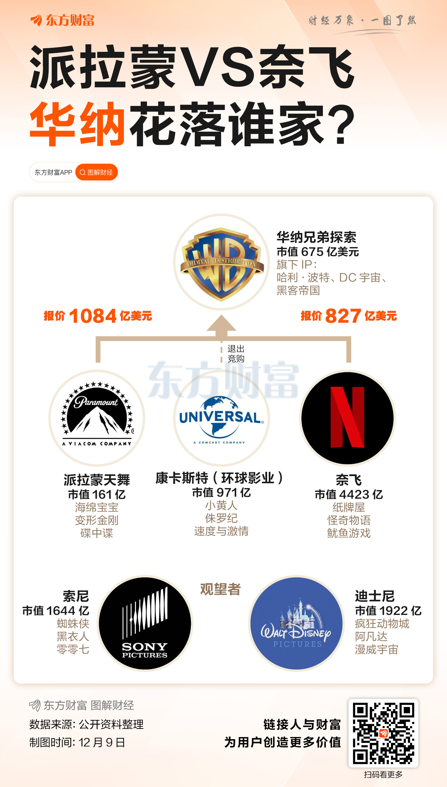 老派VS新贵 奈飞收购华纳兄弟竟遭派拉蒙截胡? 专业金融数据,下一代智能终端 ![]() 21世纪福克斯被迪士尼收购曾震惊好莱坞,如今更激烈的争夺战再次上演。12月5日,奈飞宣布将以现金加股票的方式,以827亿美元收购华纳兄弟探索公司旗下的核心影视业务,包括传奇的华纳兄弟制片厂、HBO电视网以及DC电影宇宙等宝贵IP。 然而这场交易遭遇意外狙击。仅在三天后派拉蒙天舞(下称派拉蒙)发布公告,宣布对华纳兄弟探索(下称华纳兄弟)发起敌意收购。派拉蒙提出以每股30美元的全现金方式收购华纳兄弟的全部流通股份,对应的华纳兄弟公司估值达到1084亿美元。而另一参与者康卡斯特(环球影业母公司)则退出了竞购。 奈飞与派拉蒙的不同在于派拉蒙强调,其收购方案涵盖华纳兄弟的全部业务。而奈飞则专注于接收华纳兄弟的影视制片厂及HBO Max流媒体服务资产,不包括其有线电视频道等资产。这一交易若完成,奈飞将获得《哈利·波特》、《指环王》等顶级IP,以及HBO《权力的游戏》、《西部世界》等精品剧集的生产能力。 奈飞首席内容官萨兰多斯在声明中表示:“我们旨在打造世界级的娱乐组合,华纳的内容遗产与我们的全球平台相结合,将为创作者和消费者创造前所未有的价值。” 不过奈飞对华纳兄弟的收购计划已经受到了监管部门的关注,可能面临反垄断调查。此前,派拉蒙曾质疑称,华纳兄弟的管理层偏好奈飞的出价,“或已放弃公平交易程序”。华纳兄弟方面则回应称,董事会一直以最高标准“全面、积极”地履行其责任。 目前看来,围绕华纳兄弟的好莱坞巨头争夺战远未结束。研究机构eMarketer的高级分析师Ross Benes表示,虽然奈飞处于主导地位,但未来想必很难一帆风顺。