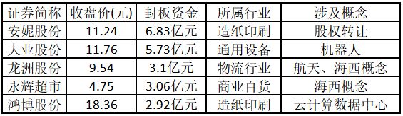 (注:主力资金净流入金额占市值比例越高的个股,说明该股被主力资金重点关注,值得重点关注。) 从封板资金来看,今日涨停板个股中,封板资金排名前5的个股包括安妮股份、大业股份、龙洲股份、永辉超市、鸿博股份。