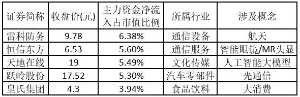 (注:主力资金净流入金额越多的涨停股,说明该股被主力资金重点关注,值得重点关注。) 主力资金净流入金额占市值比例排名前5的个股分别为雷科防务、恒信东方、天地在线、跃岭股份、皇氏集团。