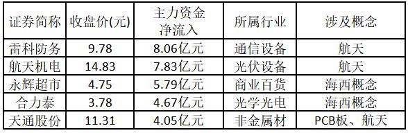 (注:创出近一年新高的涨停股,说明该股走出重要突破行情,值得重点关注。) 从主力资金来看,今日涨停板个股中,主力资金净流入金额排名前5的个股分别为雷科防务、航天机电、永辉超市、合力泰、天通股份。欢迎大家关注微信公众号“道达号”,其“道达涨停复盘”栏目为大家解读。
