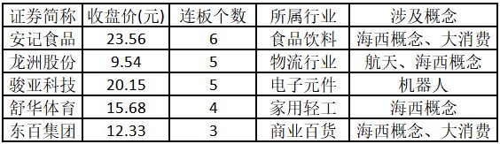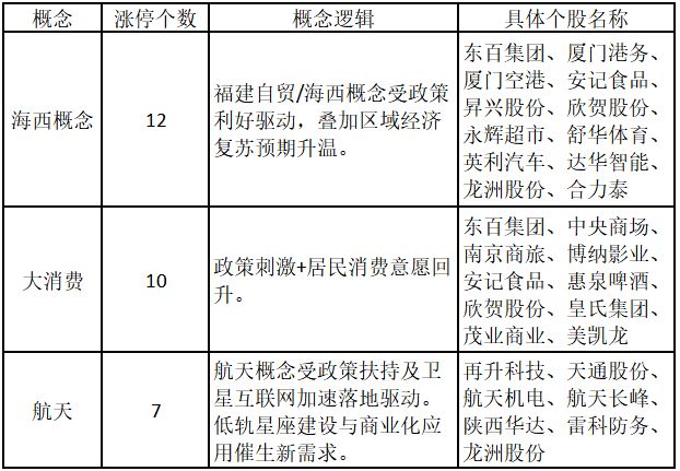(注:行业涨停板个股越多,说明该行业被资金重点关注,是当前热门行业。) 从概念特征来看,今日涨停板个股中,海西概念、大消费和航天概念的个股最多。